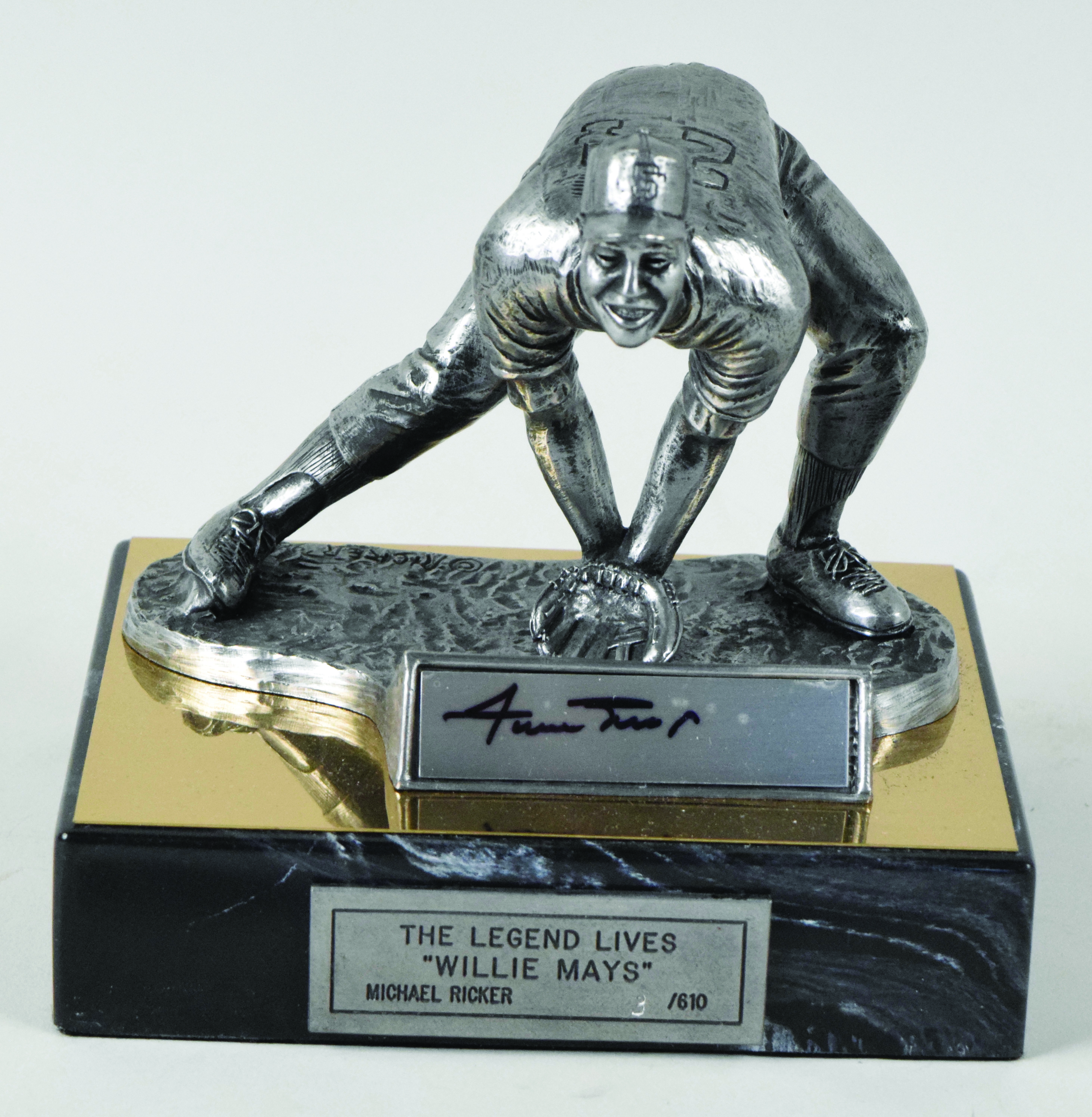 Description:Willie Mays autographed "The Legend Lives" limited edition sculptural piece (EX-NM) Nicely done cast pewter figural statue has an inset "Willie Mays" black marker signature which rates 8/9 out of 10. Metal placard on the front reads "The Legend Lives, Willie Mays" with Michael Ricker artist name noted below along with "3/610" numbering. Stands 6.25" tall with 6.75"x6.25" base. Includes certificate of provenance from the Willie Mays Collection: EX-NM ($300-$500)
