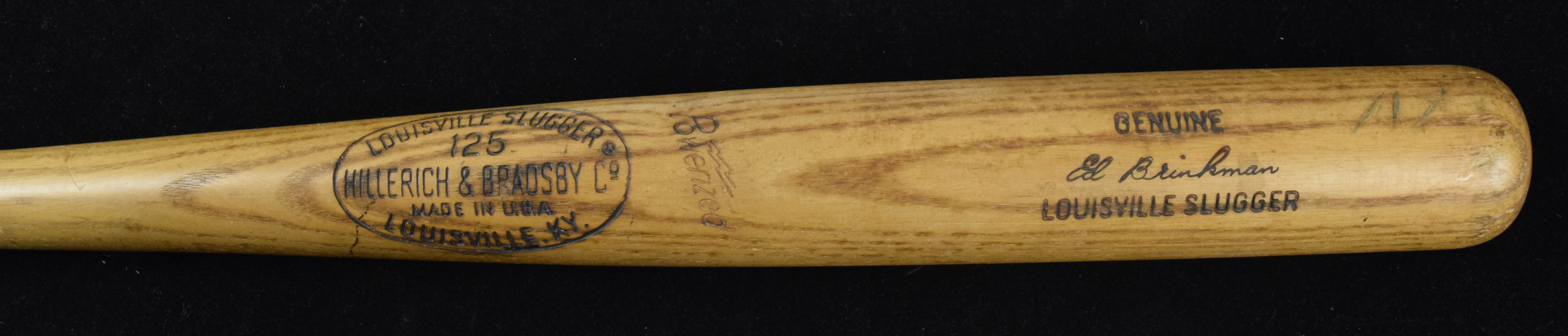 Description:Ed Brinkman professional model baseball bat, c. 1965-73 (VG). Louisville Slugger bat with "C12" stamped on the knob and Brinkman's name burned in the barrel measures 35" long, with Brinkman's number "11" also written in marker on the knob. Bat has evident use, including a large handle crack (with a piece of the barrel splintered off), cleat marks and ball contact marks. There is also a piece of tape on the handle: VG