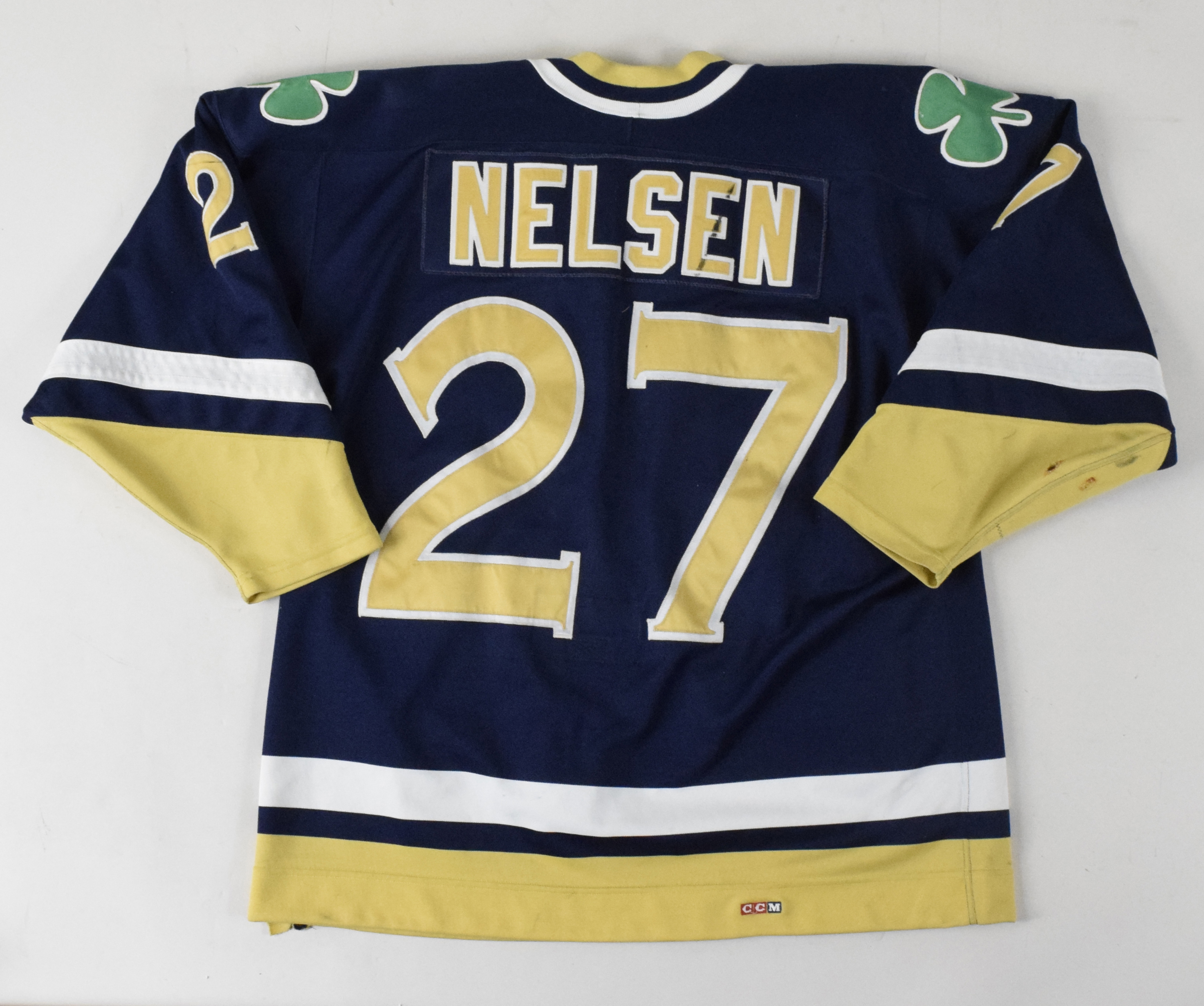 Description:Ben Nelsen Notre Dame hockey collegiate model jersey, c. 1993-96 (EX). Navy blue CCM size 52 Notre Dame jersey with green shamrock shoulder patches displays excellent use, including contact abrasions, small tears and marks mostly in the shoulder area. Jersey with "Nelson" nameplate and #27 on the back is attributed to Ben Nelsen, a defenceman who played at Notre Dame from 1993-96: EX.