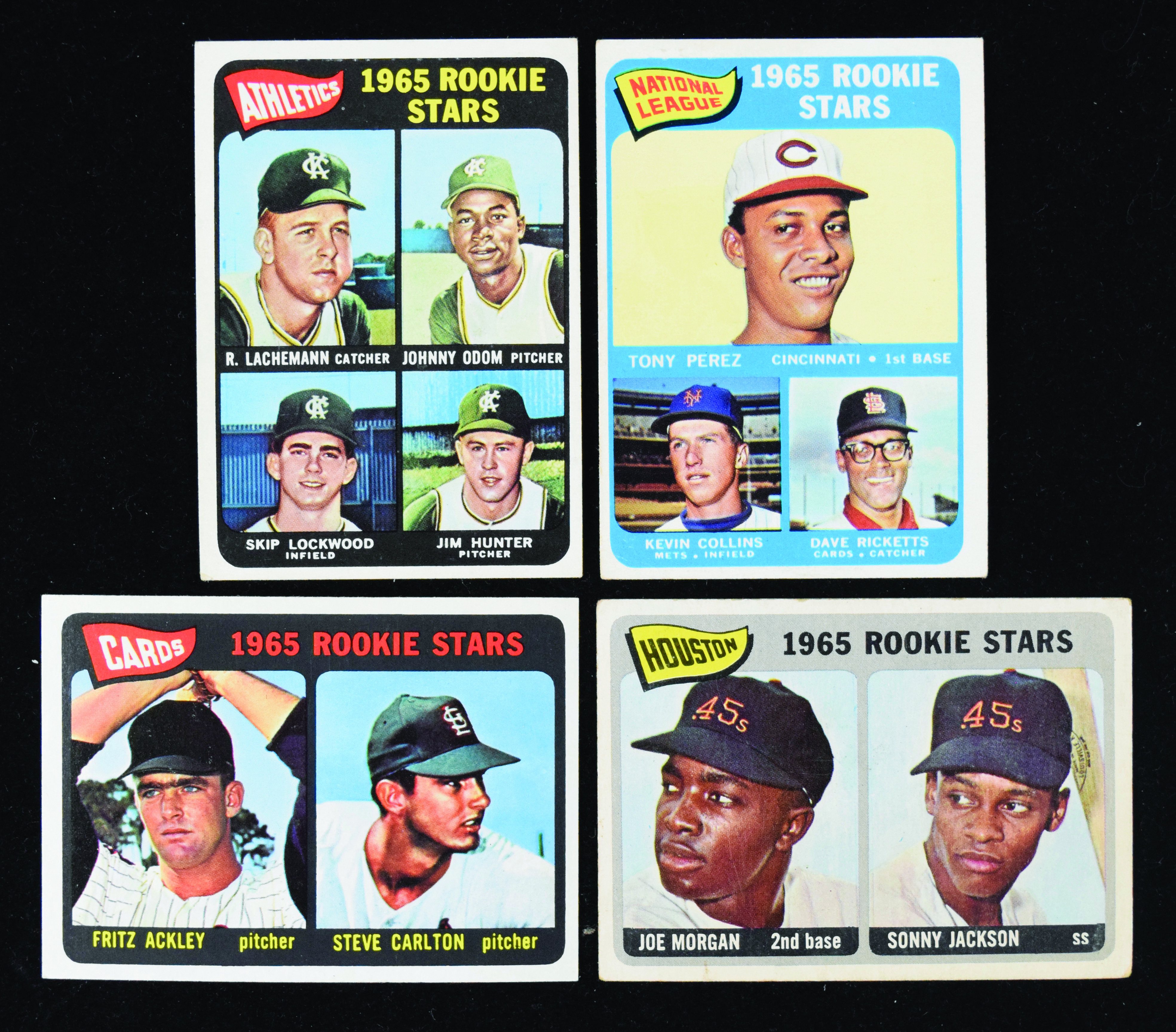 Description:Lot of (4) 1965 Topps RCs, with Carlton, Perez, Morgan and Hunter (FR-EX). Lot of key rookie cards from the 1965 Topps set includes #s 16 Joe Morgan (FR), 477 Steve Carlton (EX), 581 Tony Perez (GD+) and 526 Catfish Hunter (VG/EX). Range: FR-EX.