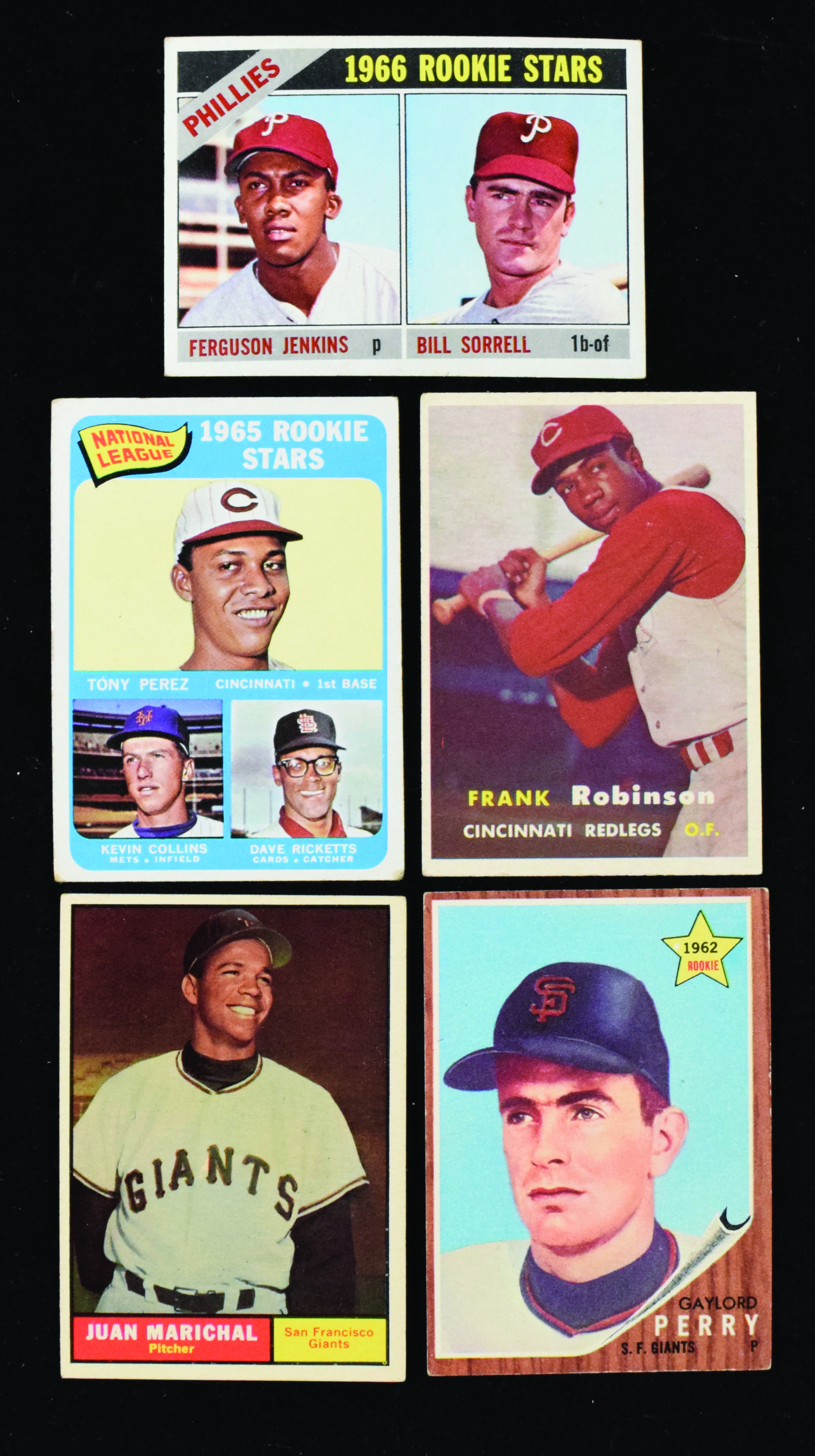 Description:Lot of (5) 1957-1966 Topps RCs, including Robinson, Marichal and Jenkins (GD-VG/EX). Assortment of Topps rookie cards includes 1957 Topps #35 Frank Robinson (GD), 1961 Topps 417 Juan Marichal (VG/EX), 1962 Topps #199 Gaylord Perry (VG/EX), 1965 Topps #581 Tony Perez (GD) and 1966 Topps #254 Fergie Jenkins (VG/EX). Range: GD-VG/EX.