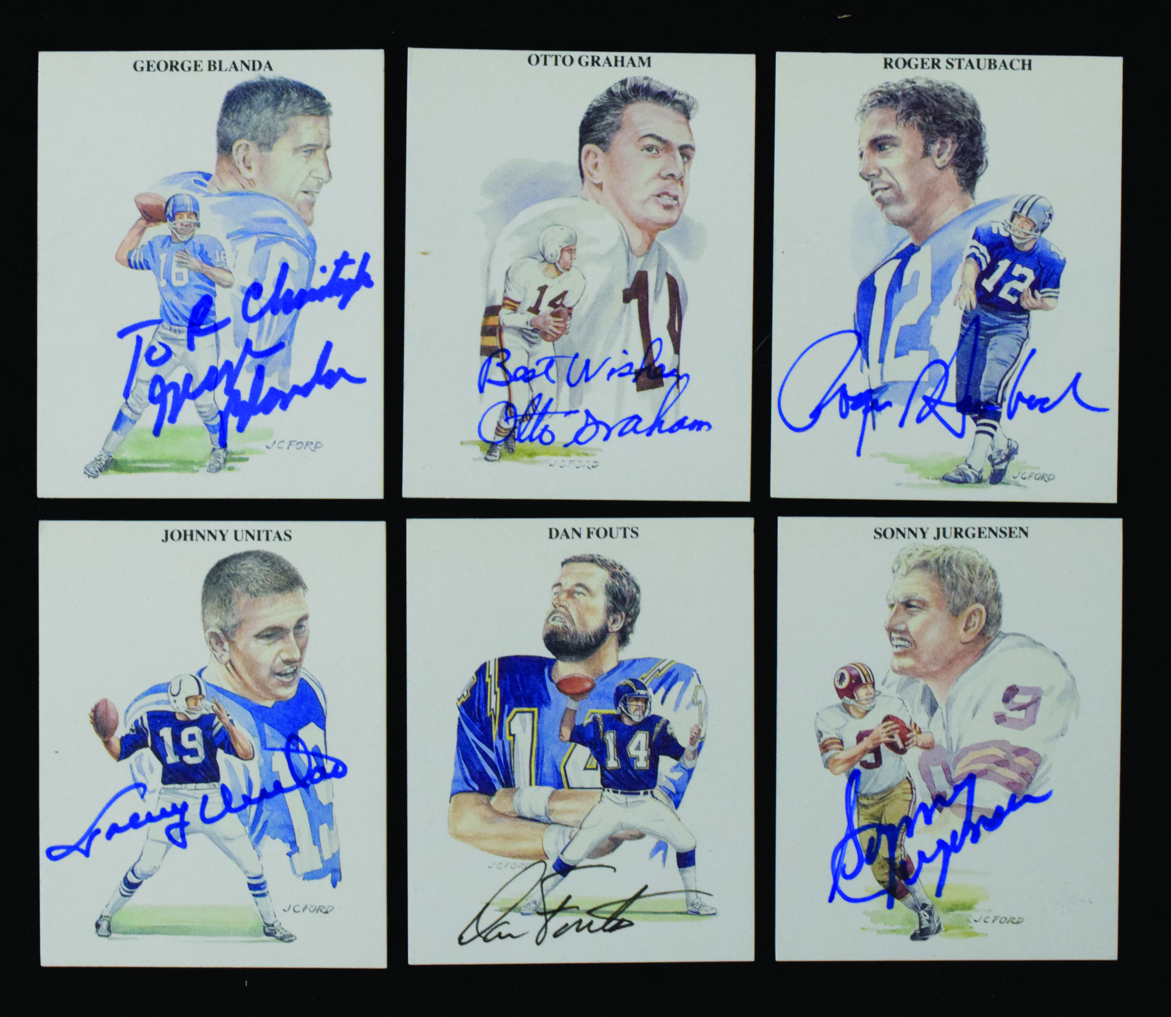 Description:Lot of (6) HOFers signed 1989 All Time Great Quarterbacks football cards - JSA (NM-NM/MT). Includes #s 5 signed by Otto Graham, 8 signed by George Blanda (personalized), 10 signed by Johnny Unitas, 12 signed by Sonny Jurgensen, 15 signed by Roger Staubach, and 17 signed by Dan Fouts. Signatures rate 8 to 10 out of 10. JSA serial #ed sticker is on the back of each card: NM-NM/MT