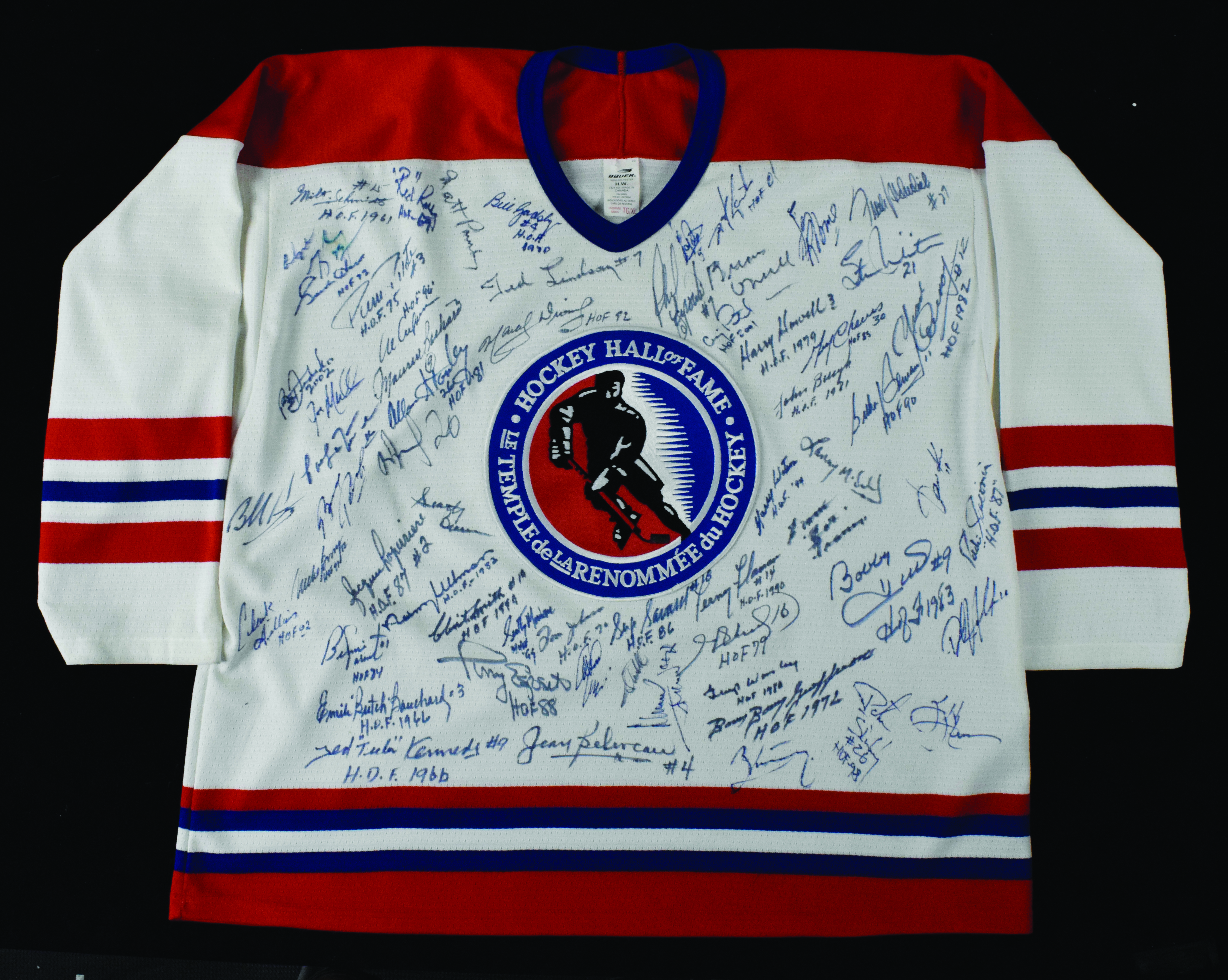 Description:Multi-signed Hockey Hall Of Fame jersey with an impressive (63) autographs including Gretzky & other top names (NM). Bauer size XL Hockey HOF sweater signed by Al Arbour, Jean Beliveau, Mike Bossy, Butch Bouchard, Scotty Bowman, John Bucyk, Gerry Cheevers, Yvon Cournoyer, Marcel Dionne, Phil Esposito, Tony Esposito, Bernie Federko, Viacheslav Fetisov, Fern Flaman, Cat Francis, Bill Gadsby, Mike Gartner, Boom Boom Gioffrion, Ed Giacomin, Clark Gillies, Wayne Gretzky, Dale Hawerchuk, Gordie Howe, Harry Howell, Bobby Hull, Tom Johnson, Red Kelly, Ted Kennedy, Dave Keon, Jari Kurri, Pat LaFontaine, Jacques Laperriere, Ted Lindsay, Frank Mahovlich, Lanny McDonald, Stan Mikita, Scotty Morrison, Joe Mullen, Brian O'Neill, Bernie Parent, Brad Park, Craig Patrick, Matt Pavelich, Gil Perreault, Pierre Pilote, Denis Potvin, Henri Richard, Maurice Richard, Larry Robinson, Borje Salming, Serge Savard, Milt Schmidt, Steve Shutt, Clint Smith, Allan Stanley, Peter Stastny, Scott Stevens, Bill Torrey, Vlad Tretiak, Norm Ullman, Harry Watson, Gump Worsley, and one unidentified. Signatures rate 7 to 9/10 (avg 8) out of 10: NM ($1,000-$2,000)