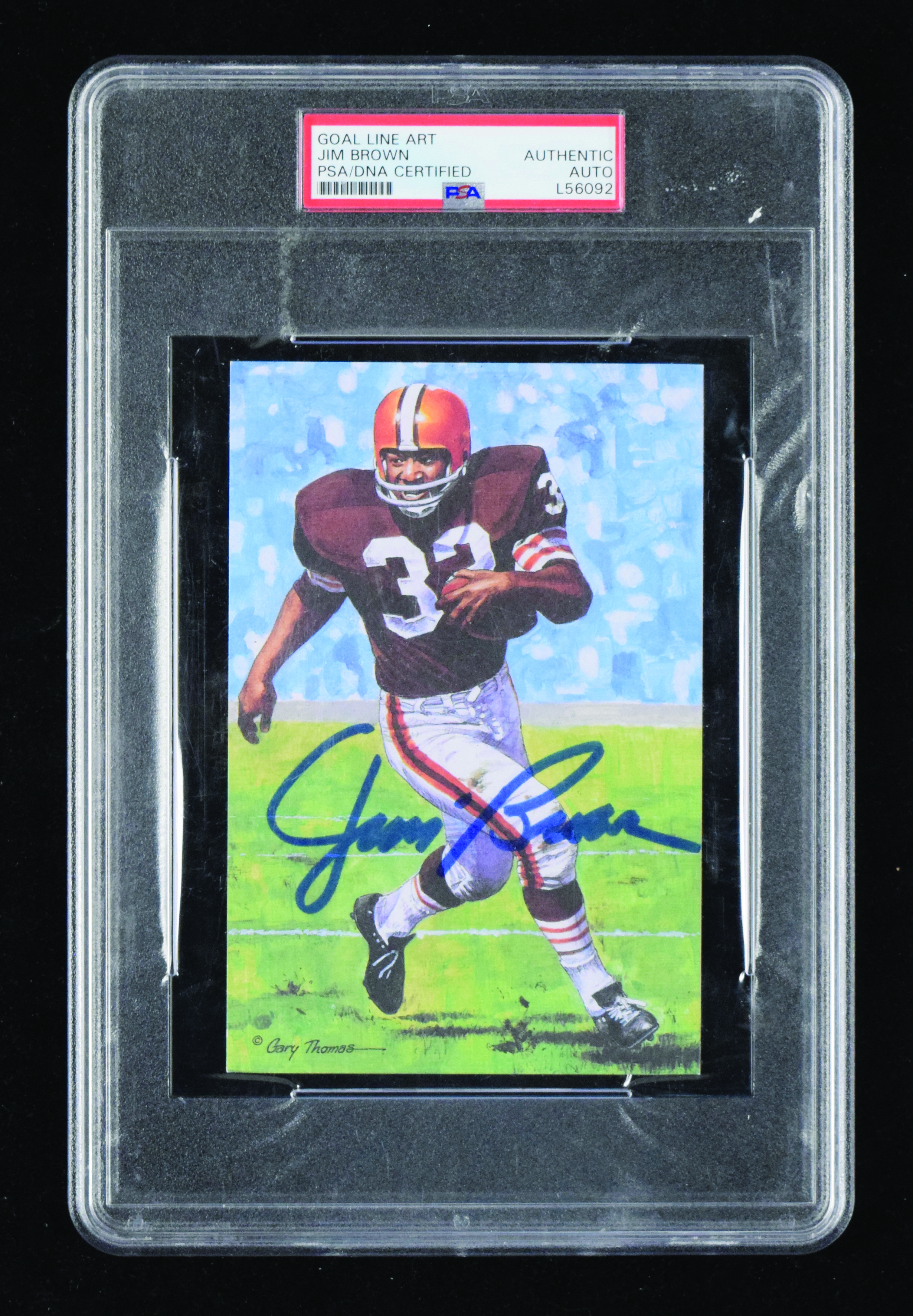 Description:Jim Brown signed 1989 Goal Line Art card - PSA/DNA (NM). Brown signed the front in blue marker. Signature rates 9/10 out of 10. Encapsulated in PSA/DNA Certified Authentic holder: NM 2100000369522