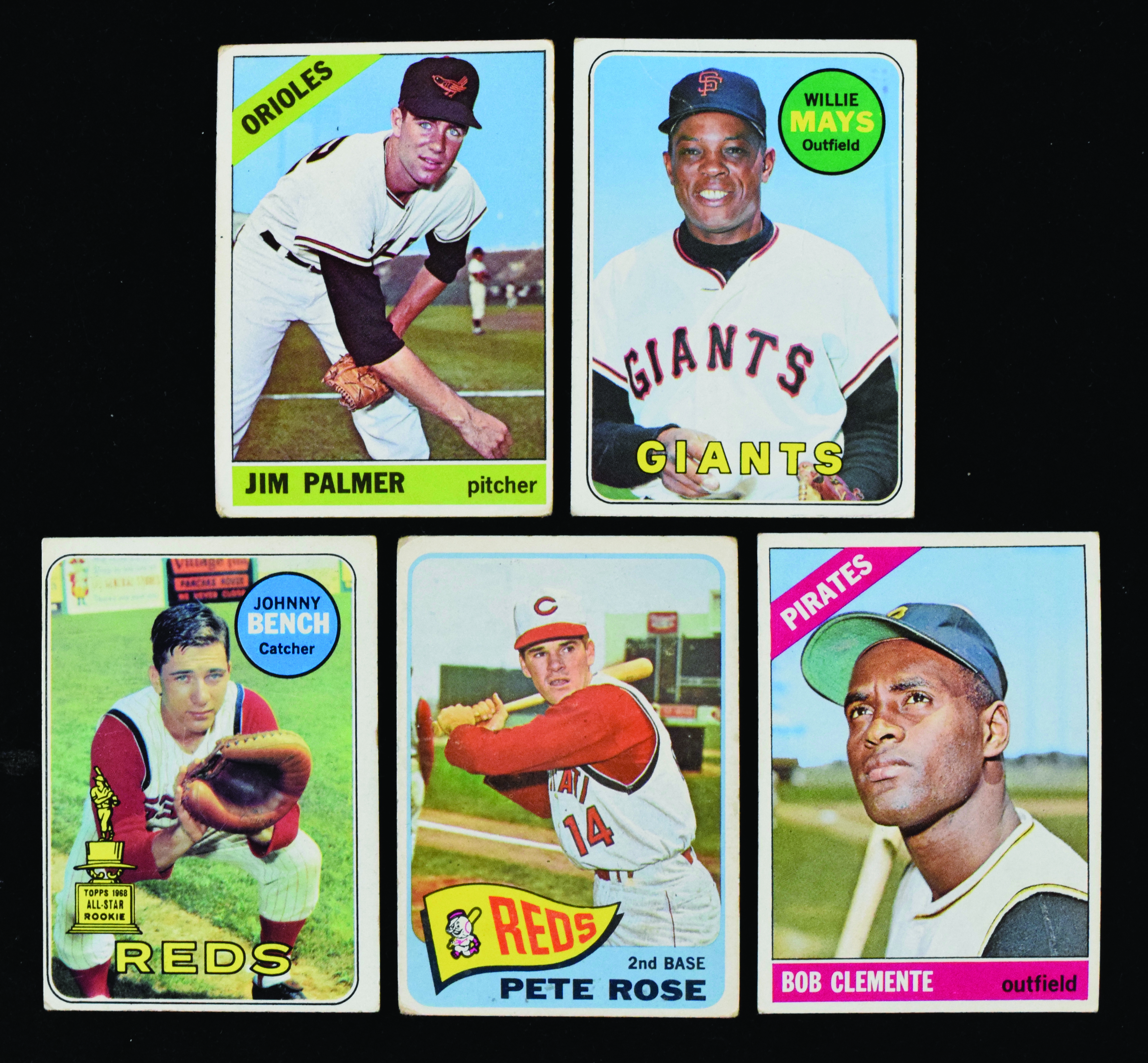 Description:Lot of (5) 1965-1969 Topps stars and HOFers with Mays, Clemente and Palmer RC (PR-VG/EX). Lower-grade assortment of 1960s Topps stars includes 1965 Topps #207 Pete Rose (FR), (2) 1966 Topps: #s 126 Jim Palmer RC (GD+) and 300 Roberto Clemente (VG/EX) and (2) 1969 Topps: #s 95 Johnny Bench (GD) and 190 Willie Mays (PR). Range: PR-VG/EX.