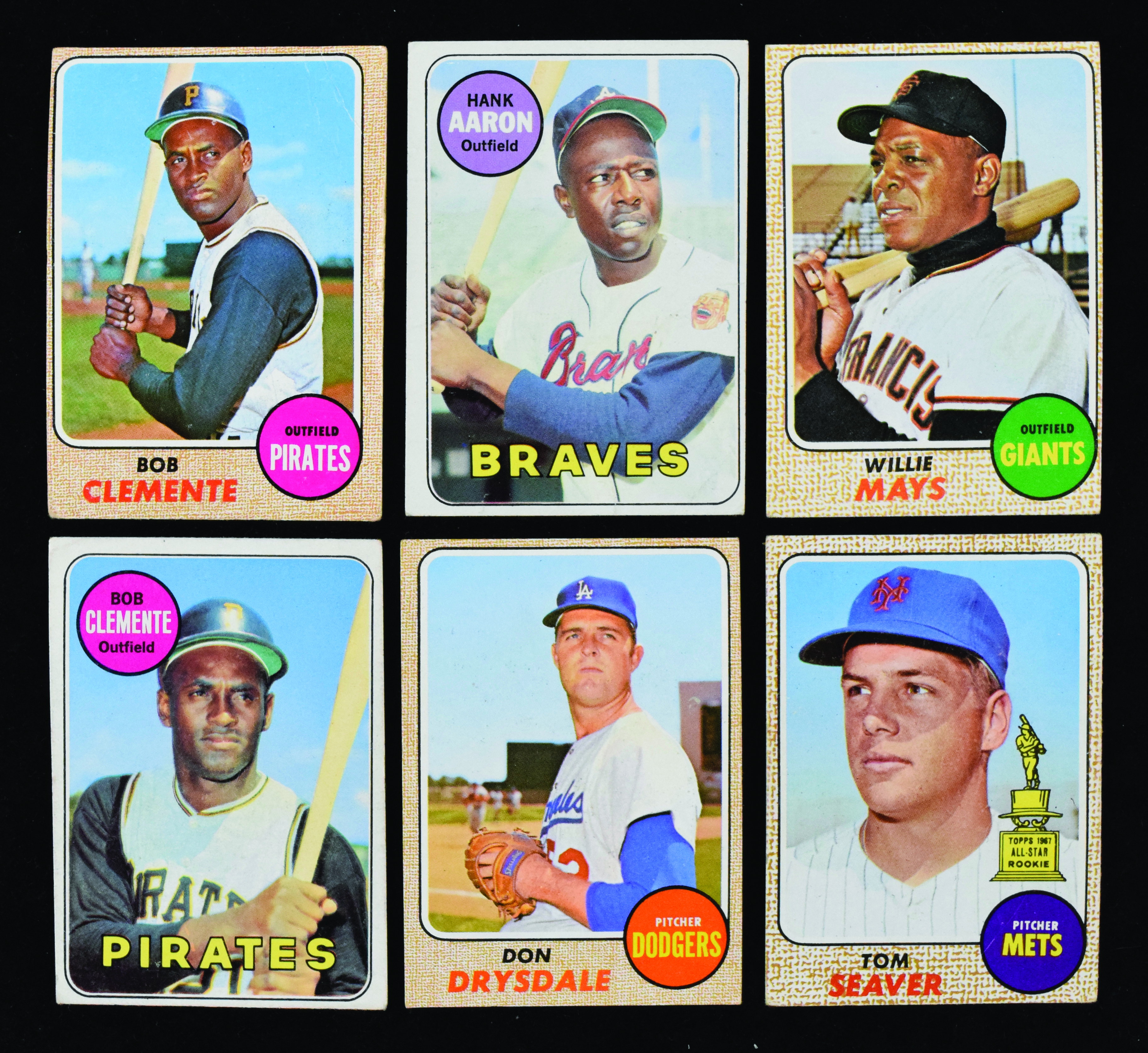 Description:Lot of (6) 1968 and 1969 Topps HOFers, with Clemente, Aaron and Mays (PR-VG/EX). Lower-grade assortment of 1968-1969 Topps stars includes (4) 1968 Topps: #s 145 Don Drysdale (VG/EX), 150 Roberto Clemente (PR), 45 Tom Seaver (GD) and 50 Willie Mays (VG/EX OC) and (2) 1969 Topps: #s 50 Roberto Clemente (GD+) and 100 Hank Aaron (FR). Range: PR-VG/EX.