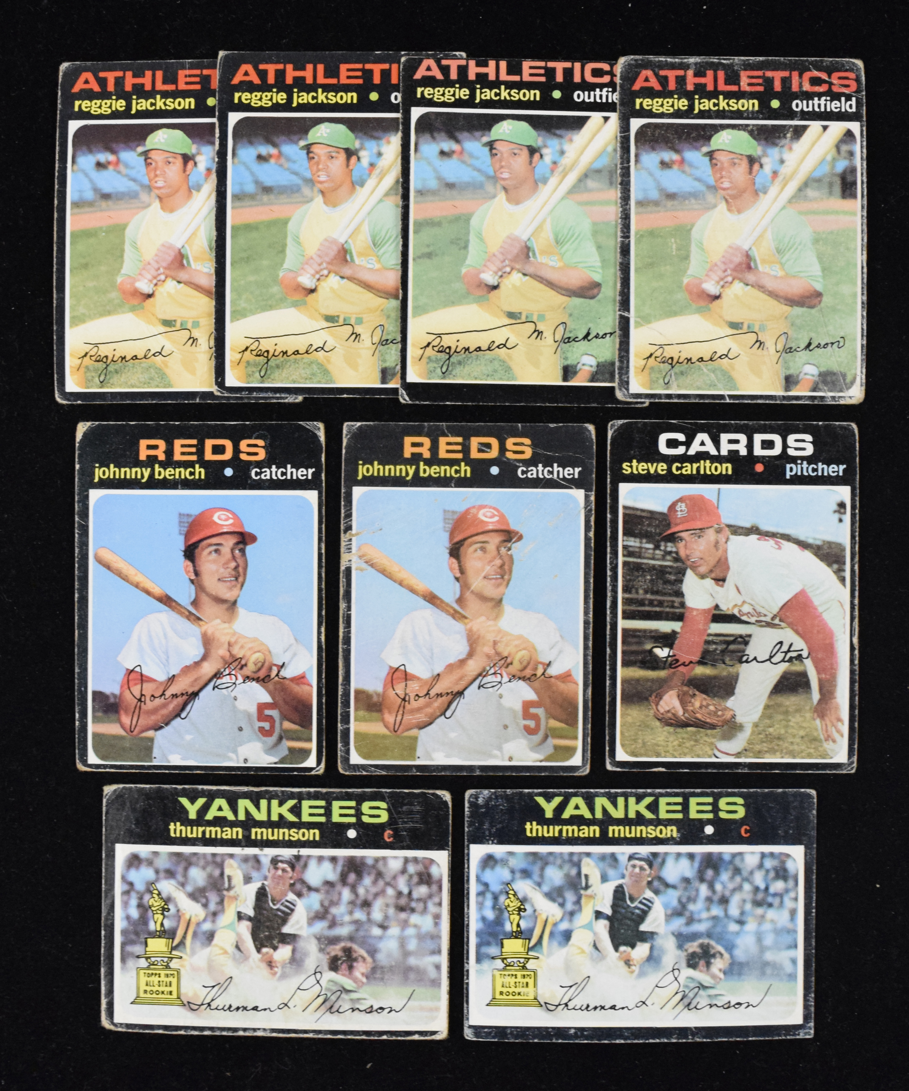 Description:Low-grade lot of (1,000+) 1971 Topps cards with minor stars and HOFers (PR-GD overall). Low-grade quantity of 1971 Topps cards (with duplication) features low numbers, commons and minor stars,with some Hall of Famers sprinkled around, including (5) #20 Reggie Jackson, (3) #250 Johhny Bench, 1 Orioles World Champions, (2) 5 Thurman Munson, 55 Steve Carlton, 180 Al Kaline, plus many League Leaders and World Series cards. Most appear PR-GD with some better. Range: PR-VG/EX.