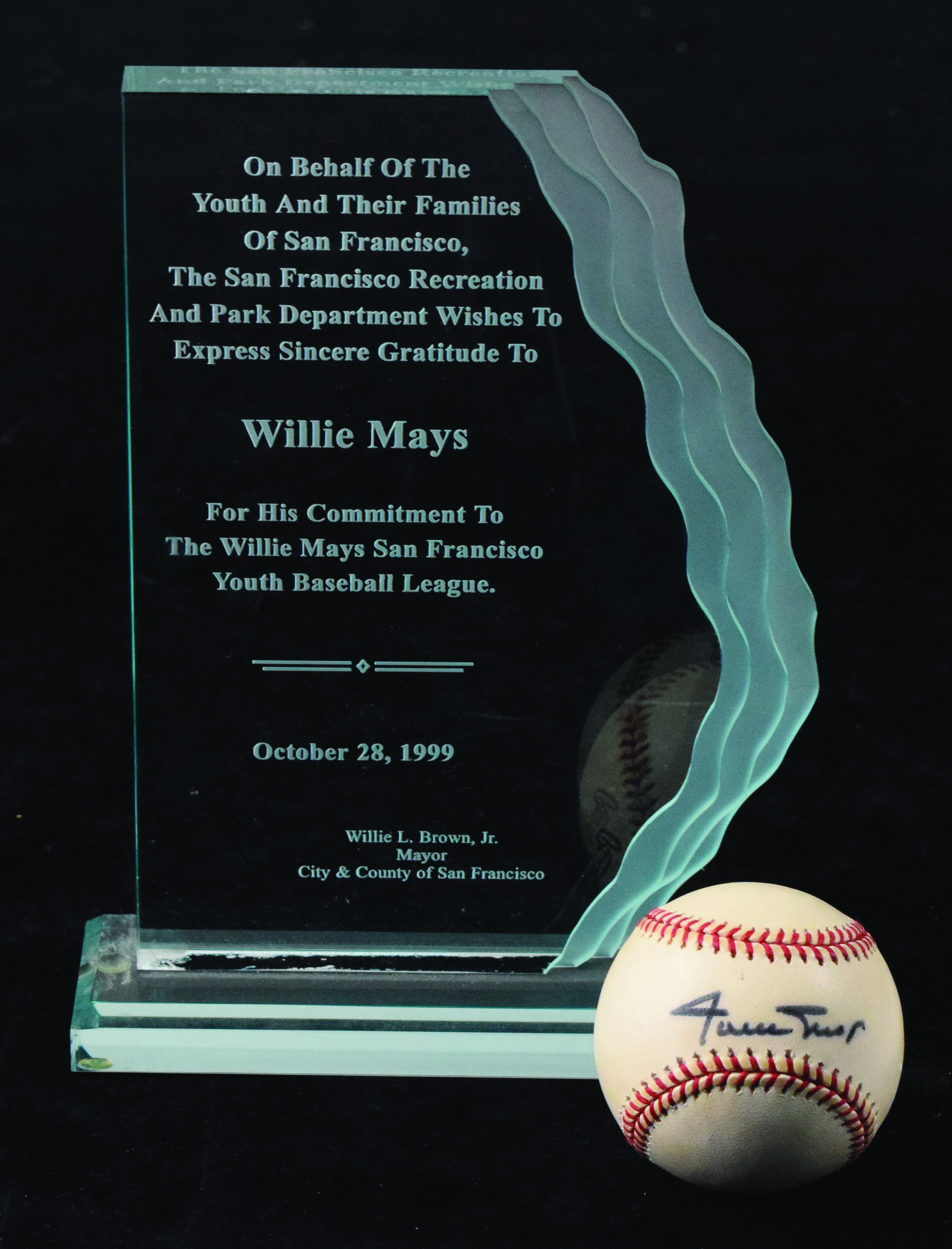 Description:1999 Willie Mays San Francisco Parks/Rec Department presentational piece with Mays signed ball (EX-NM) Includes lucite presentational piece with engraved text reading, "On Behalf Of The Youth And Their Families of San Francisco, The San Francisco Recreation And Park Department Wishes To Express Sincere Gratitude To Willie Mays, For His Commitment To The Willie Mays San Francisco Youth Baseball League...1999..." The piece stands 9.75" tall; toned Rawlings L.Coleman ONL baseball signed in marker rating 7 out of 10. There is a Willie Mays Authentic Signature sticker affixed; certificate of provenance from the Willie Mays Collection: EX-NM ($500-$750)