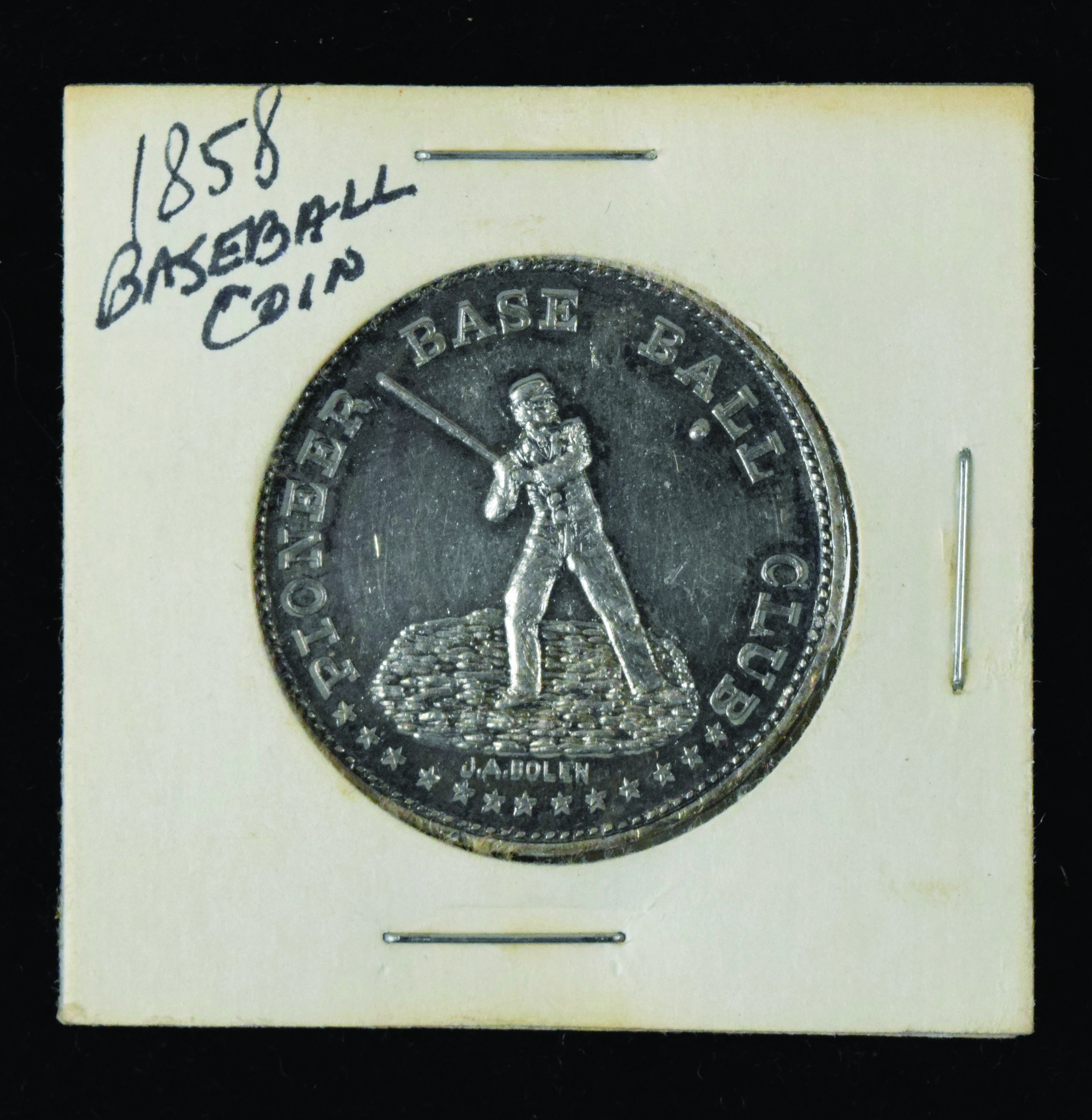 Description:Pioneer Base Ball Club medallion by J.A. Bolen, c.1861 (VG/EX). Early baseball themed medallion measures just over 1" in diameter. It believed that (125) or fewer were produced in the period. One side features a batter likeness with "Pioneer Base Ball Club" lettered around the edge. "J.A.Bolen" mark appears at the bottom. Opposite has their 1858 date of founding and notes their use of Hampden Park as home grounds. Surfaces display some mild handling and age related wear. One of the earliest baseball related pieces produced at this level of quality: VG/EX ($1,000-$2,000)