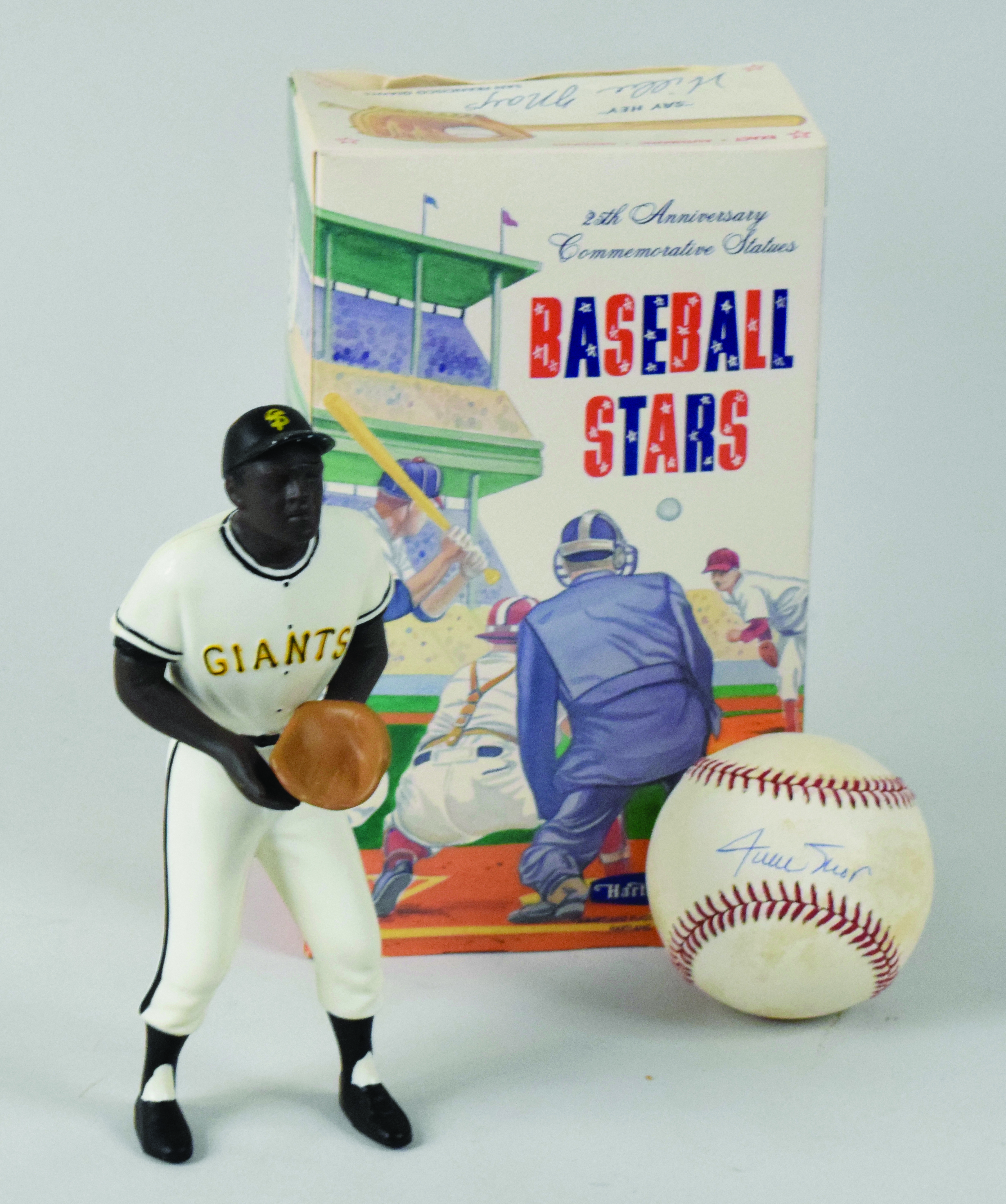 Description:Willie Mays 25th Anniv. Hartland statue with single signed baseball (EX-EX/MT) Includes toned Rawlings L.Coleman ONL ball which has been signed in ink rating 8 out of 10 (Willie Mays Authentic Signature sticker affixed); 25th Anniversary Hartland statue (issued in 1988) of Mays (NM) which is in the original box (EX with some wear). Includes certificate of provenance from the Willie Mays Collection: EX-EX/MT