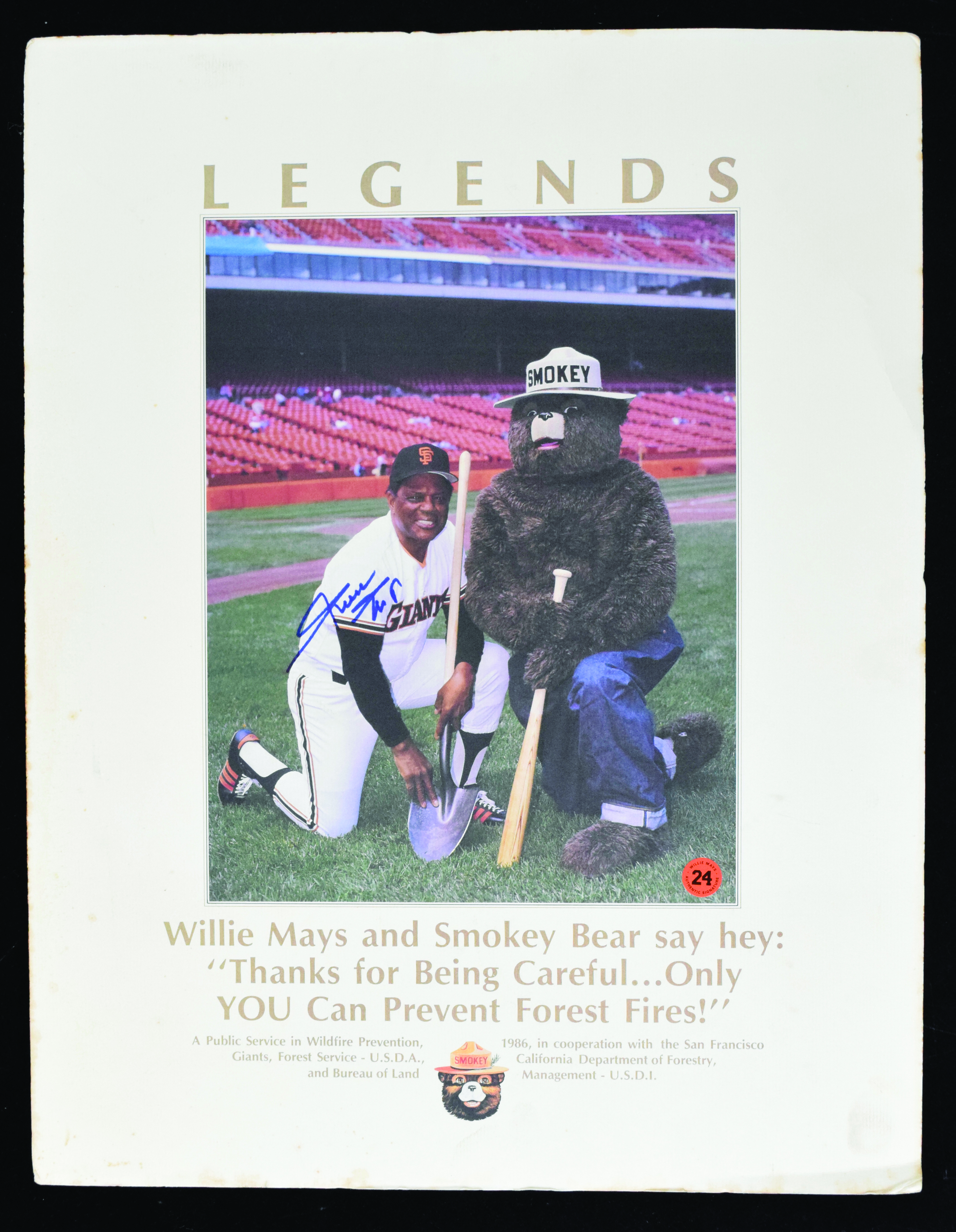 Description:Willie Mays autographed "Legends" poster (Sig. NM, Poster VG) "Legends" poster has been signed "Willie Mays" in marker rating 9 out of 10. He is shown with Smokey The Bear promoting fire safety. Measures 17"x22" and been mounted to heavy stock backing (will ship flat) with some discoloration and wear that could largely be matted out when framed for display. Willie Mays Authentic Signature sticker affixed and includes certificate of provenance from the Willie Mays Collection: Sig. NM, Poster VG
