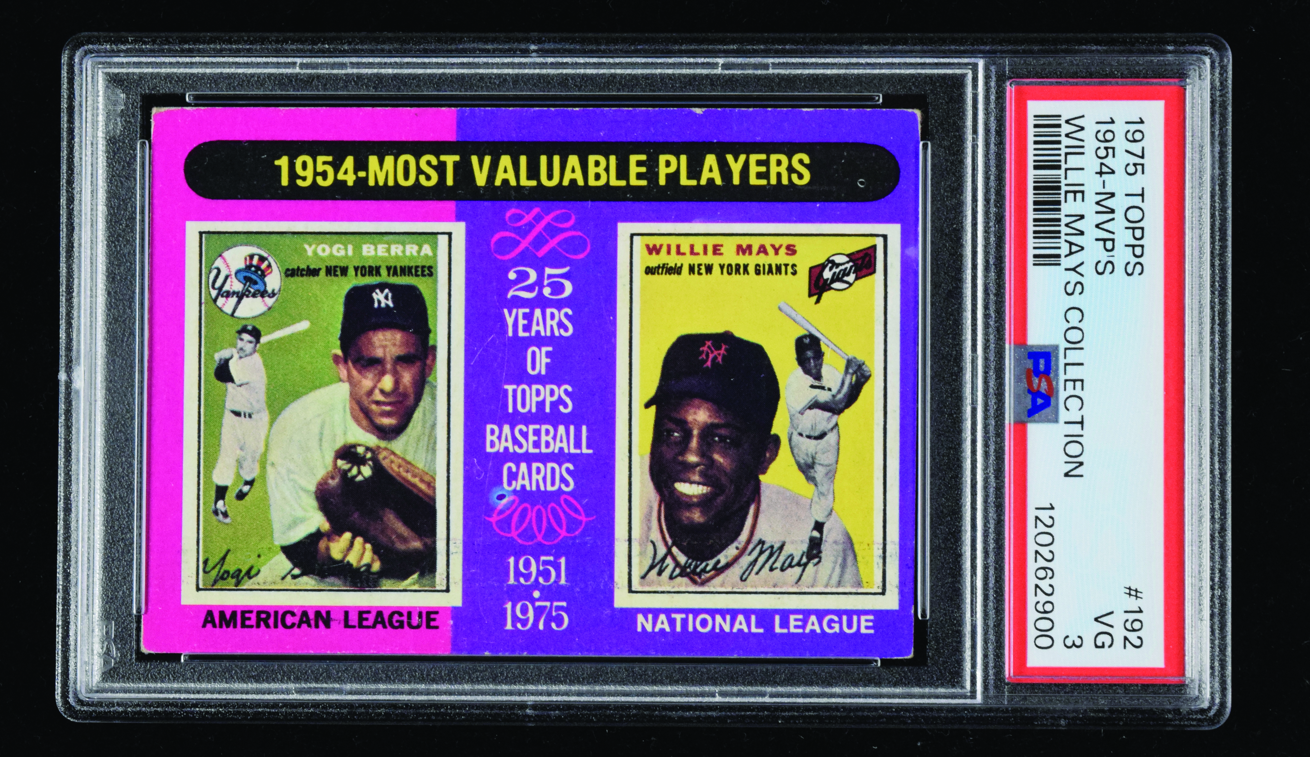 Description:1975 Topps #192 Willie Mays and Yogi Berra MVPs (PSA VG 3 - Mays Collection). Vintage card is encapsulated by PSA with special "Willie Mays Collection" pedigree. Scattered wear: PSA VG 3