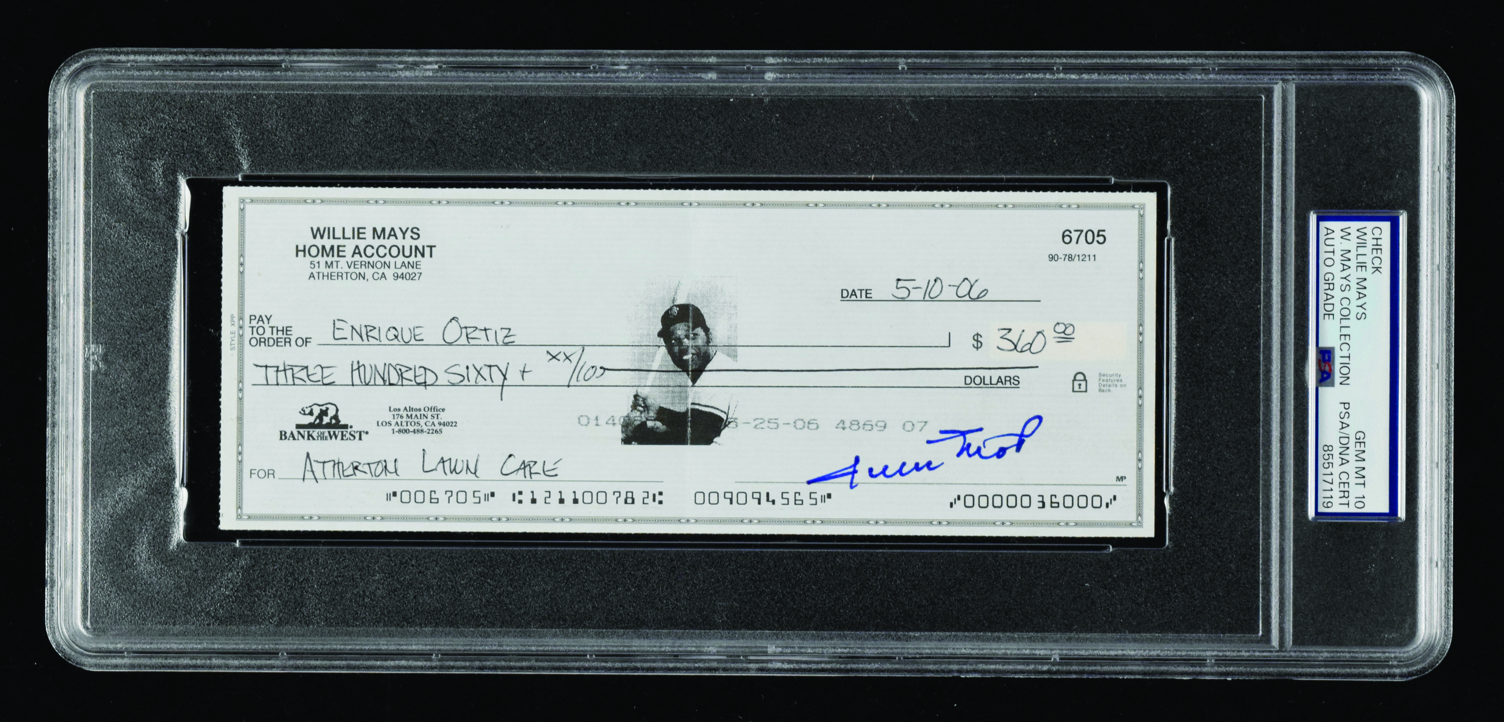 Description: Willie Mays autographed check (PSA/DNA Gem Mint 10) Personal check signed "Willie Mays" at lower right with the autograph graded "Gem Mint 10." Typical bank cancellations and handling wear. Encapsulated by PSA with special "W.Mays Collection" pedigree noted on the label: PSA/DNA Gem Mint 10