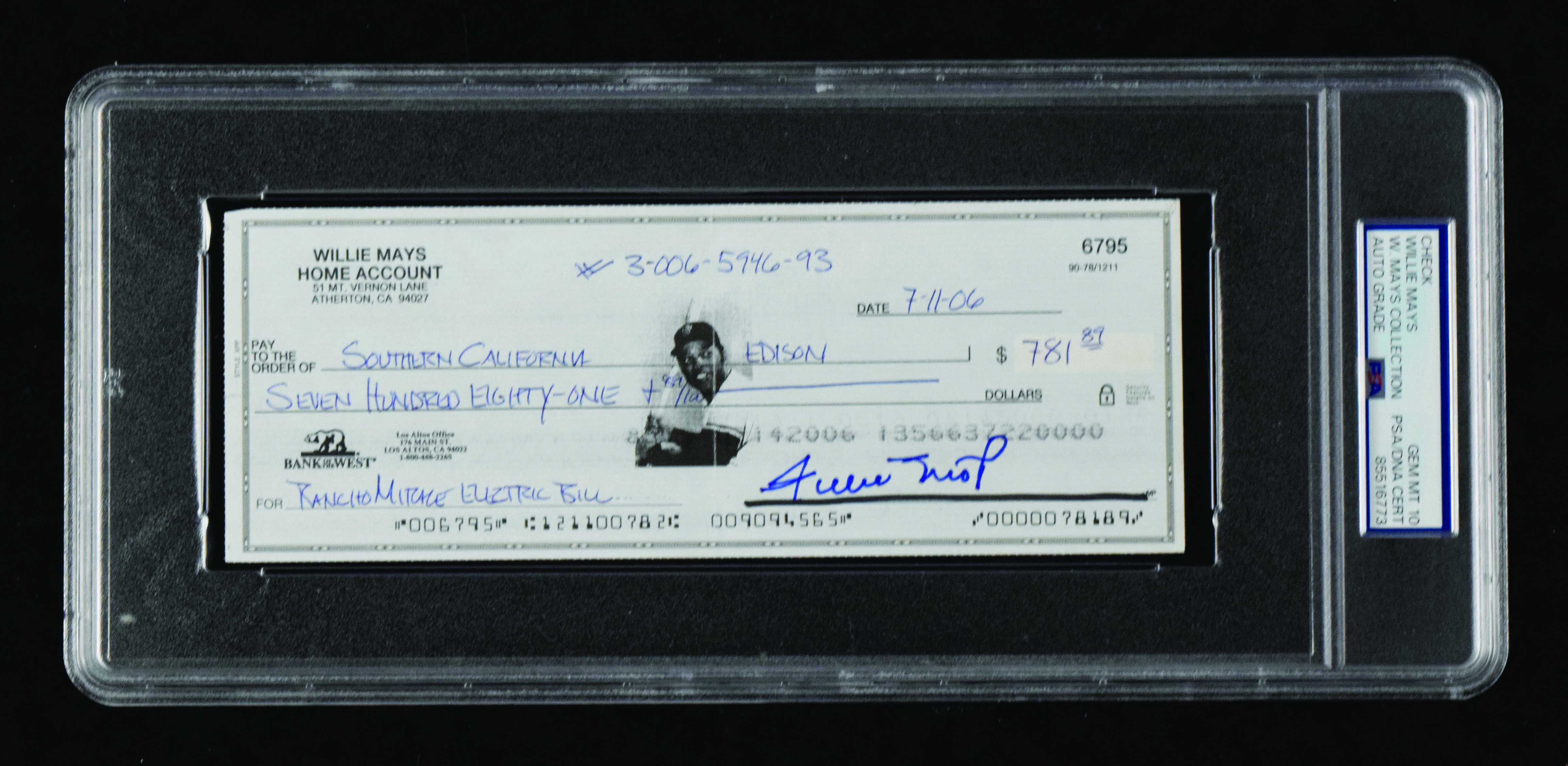 Description:Willie Mays autographed check (PSA/DNA Gem Mint 10) Personal check signed "Willie Mays" at lower right with the autograph graded "Gem Mint 10." Typical bank cancellations and handling wear. Encapsulated by PSA with special "W.Mays Collection" pedigree noted on the label: PSA/DNA Gem Mint 10