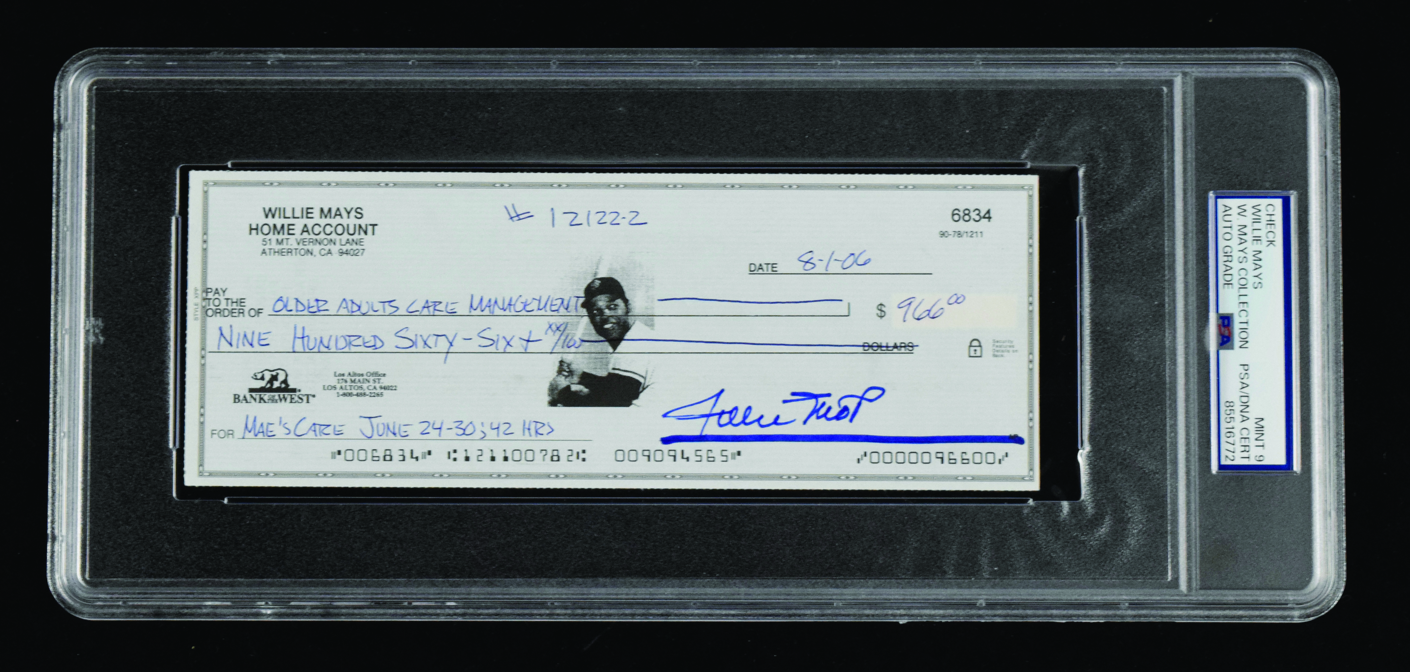 Description: Willie Mays autographed check (PSA/DNA Mint 9) Personal check signed "Willie Mays" at lower right with the autograph graded "Mint 9." Typical bank cancellations and handling wear. Encapsulated by PSA with special "W.Mays Collection" pedigree noted on the label: PSA/DNA Miny 9