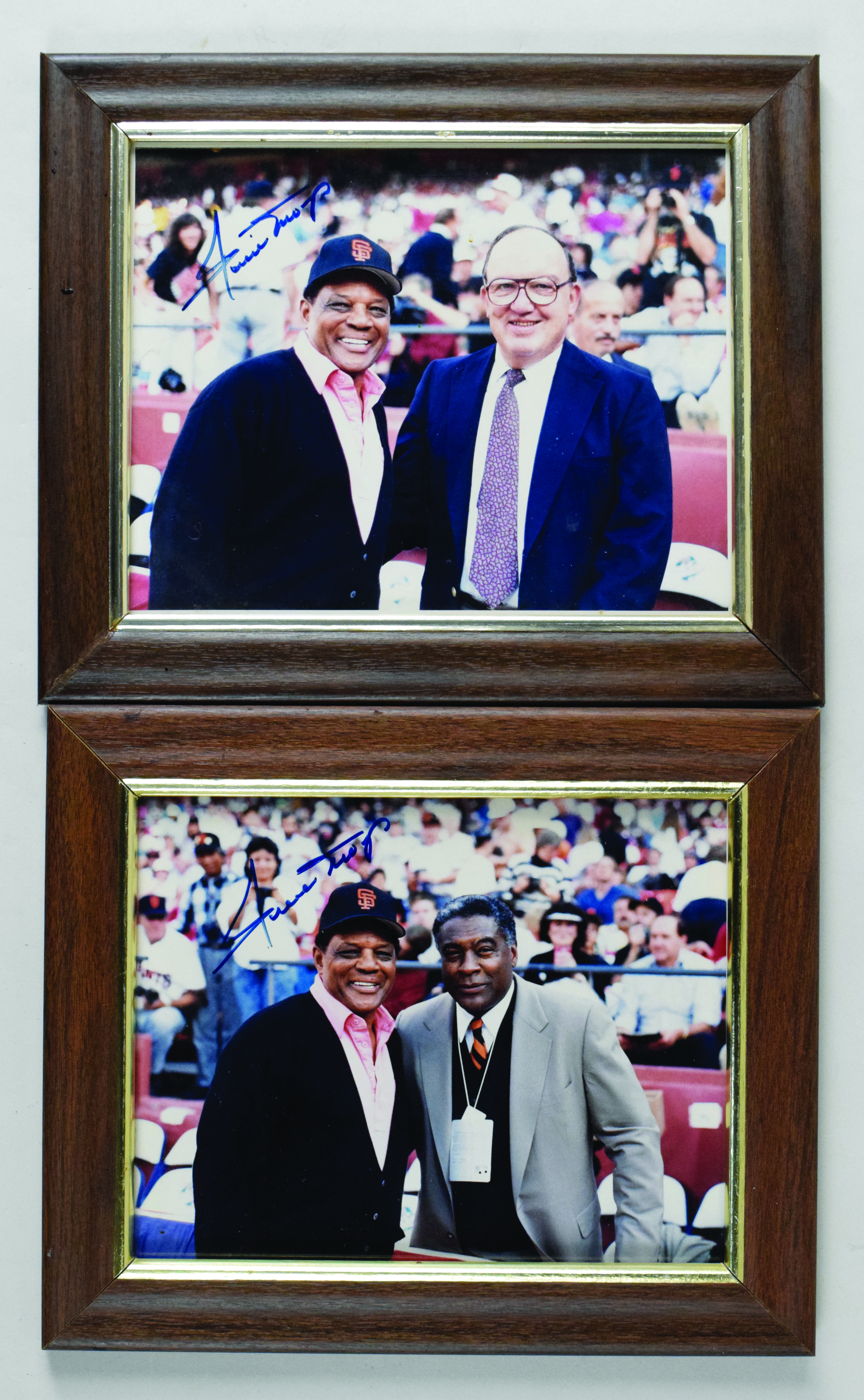 Description:Willie Mays autographed photos with Bill White and Fay Vincent (2) (EX-NM) Pair of 8"x10" color photos have each been signed "Willie Mays" in marker rating 7/8-8 out of 10. Framed to slightly larger dimensions as displayed within the Mays home (some wear/soiling to frames) and includes certificate of provenance from the Willie Mays Collection: EX-NM