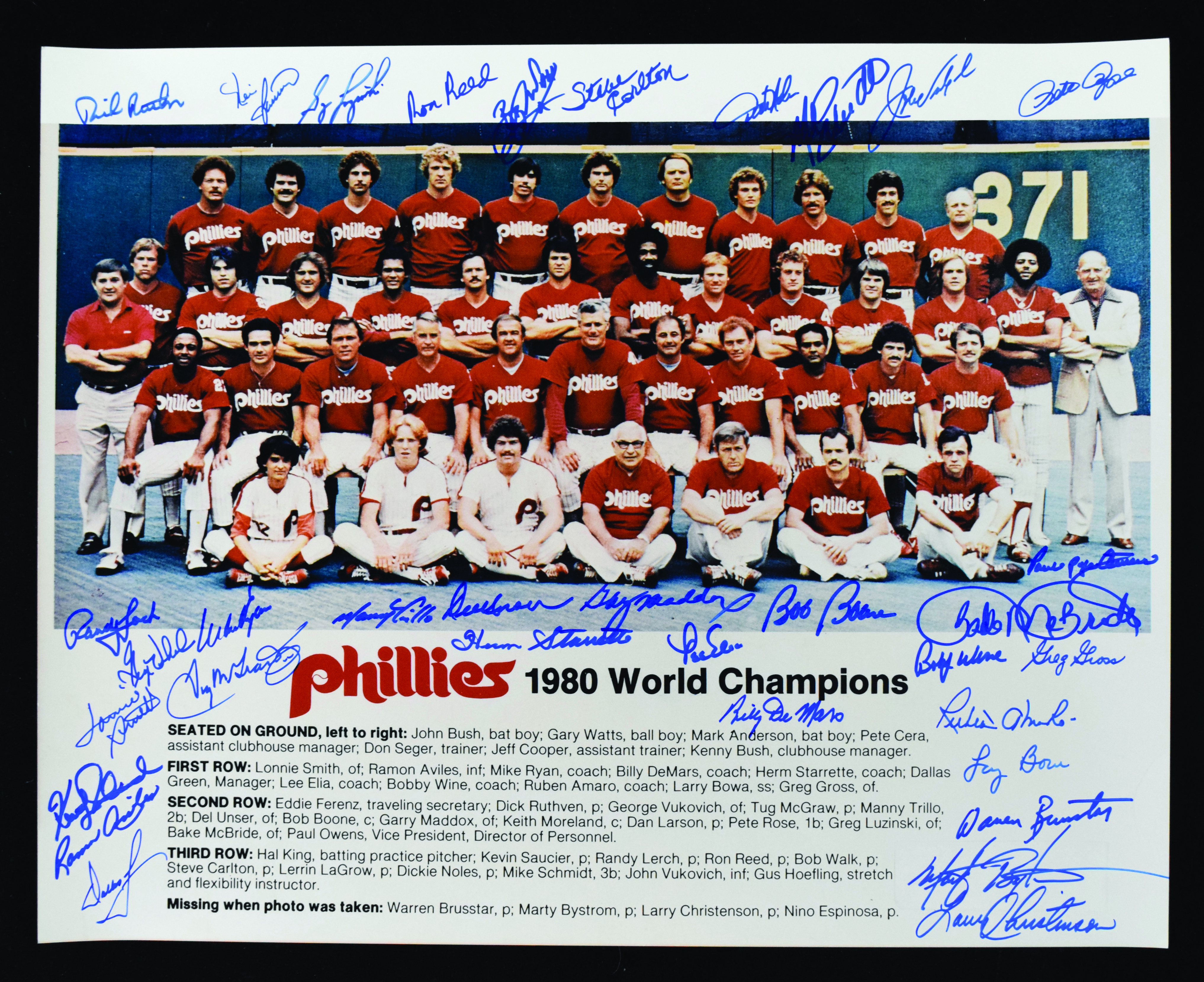 Description:1980 World Series champion Philadelphia Phillies team signed 16"x20" photograph (NM). Signed by (34) including Paul "Pope" Owens, Dallas Green, Mike Schmidt, Steve Carlton, Pete Rose, Tug McGraw, Garry Maddox, Larry Bowa, Bob Boone, Greg Luzinski, Manny Trillo, Bake McBride, Ron Reed, Dick Ruthven, Lonnie Smith, Marty Bystrom, Larry Christenson, Del Unser, Greg Gross, Bob Walk, and others. Signatures rate 8 to 10 out of 10: NM ($500-$750)