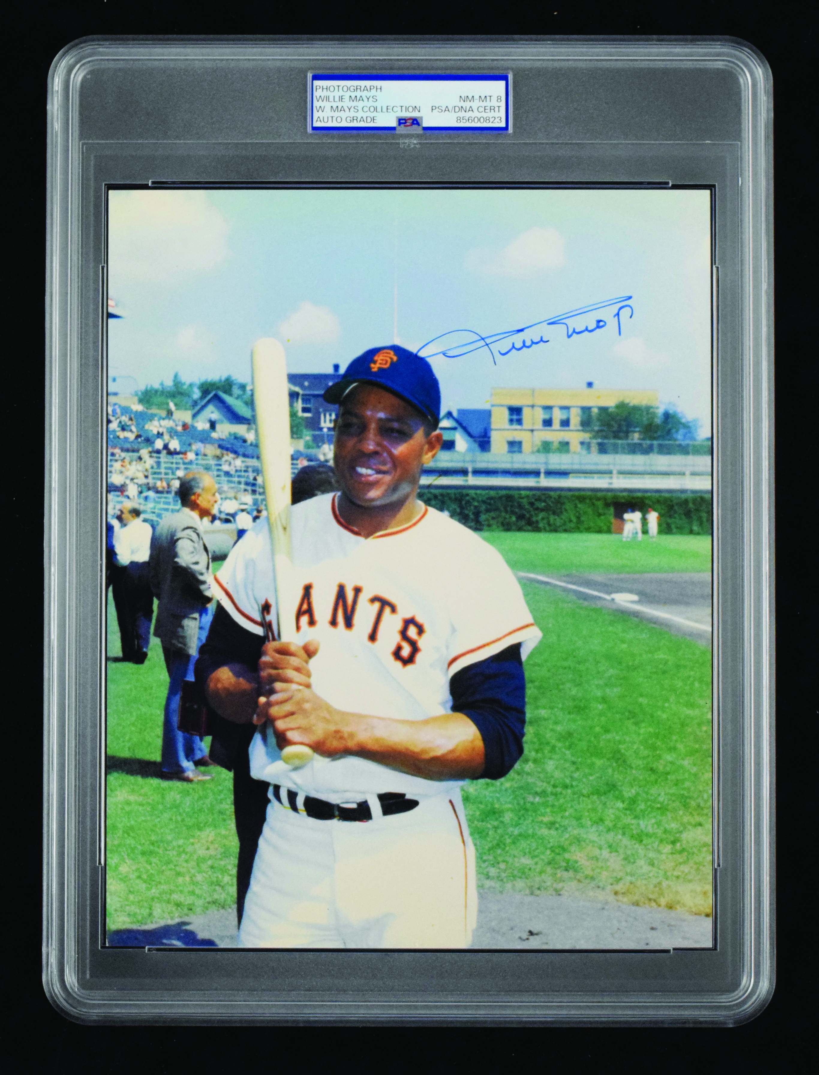 Description:Willie Mays autographed 8"x10" photograph (PSA/DNA NM-MT 8). Color photo signed in marker with the autograph graded NM-MT 8. Encapsulated by PSA with "W. Mays Collection" pedigree noted on the label: PSA NM-MT 8