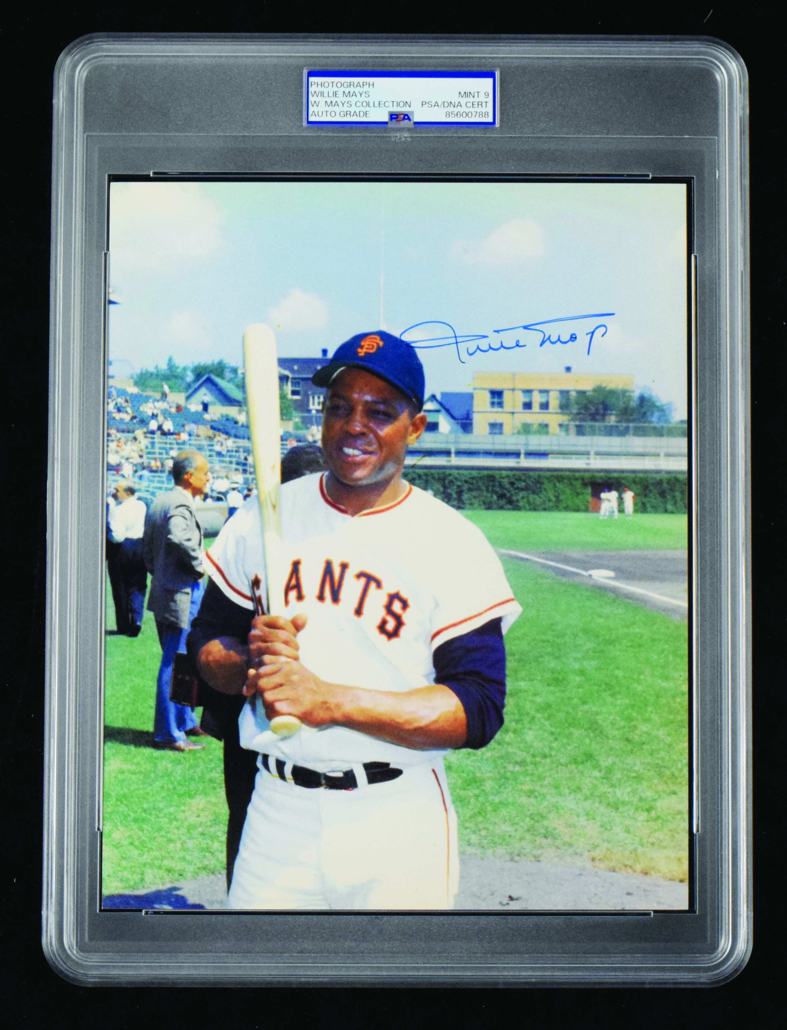 Description:Willie Mays autographed 8"x10" photograph (PSA/DNA Mint 9). Color photo signed in marker with the autograph graded NM-MT 8. Encapsulated by PSA with "W. Mays Collection" pedigree noted on the label: PSA Mint 9
