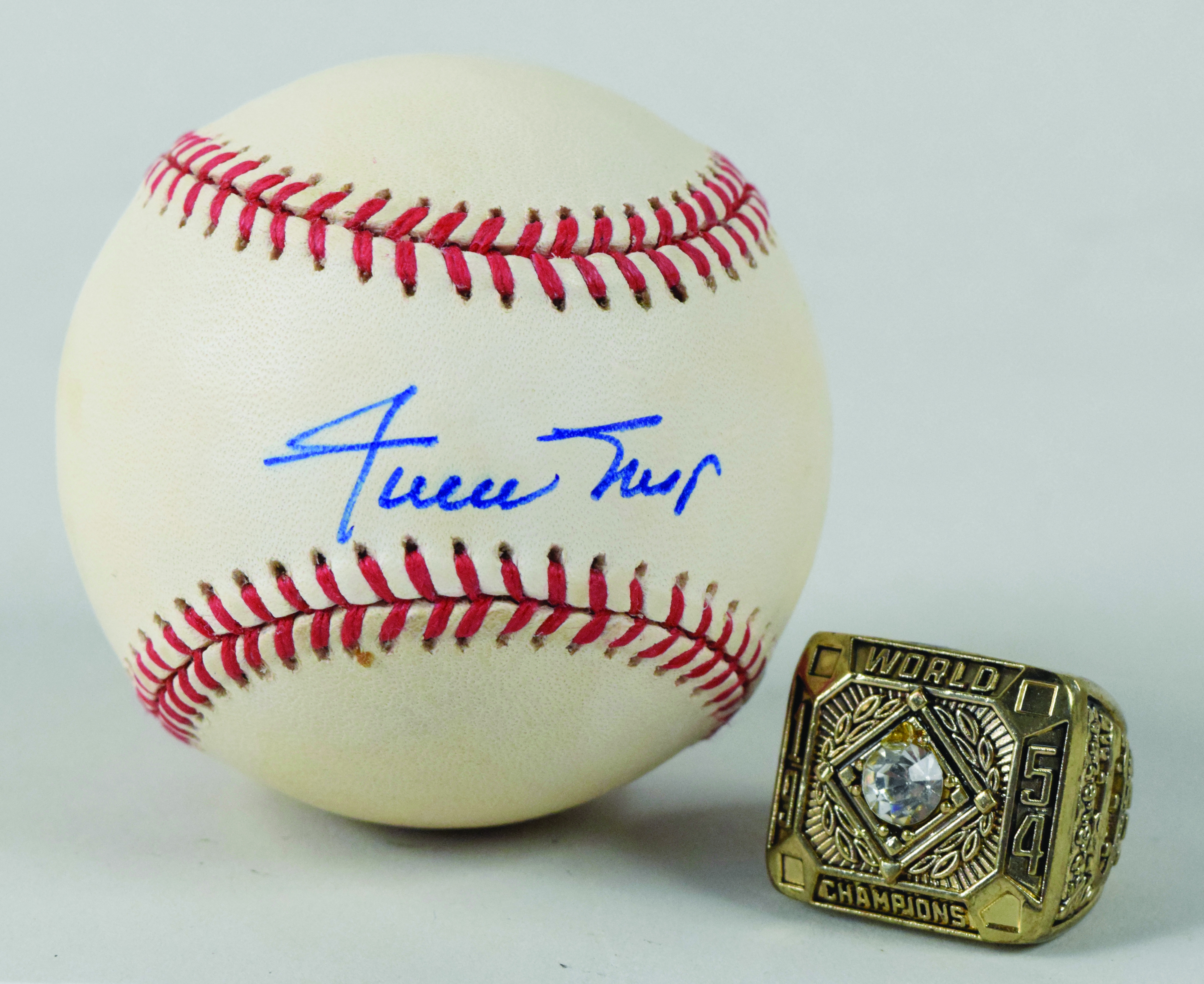 Description:1954 New York Giants commemorative ring with Willie Mays signed ball (EX-NM) Modern cast metal commemorative ring done in honor of the 1954 New York Giants displays some light handling wear; Lightly toned Rawlings L.Coleman ONL baseball signed in marker rating 7/8-8 out of 10. Includes certificate of provenance from the Mays Collection: EX-NM