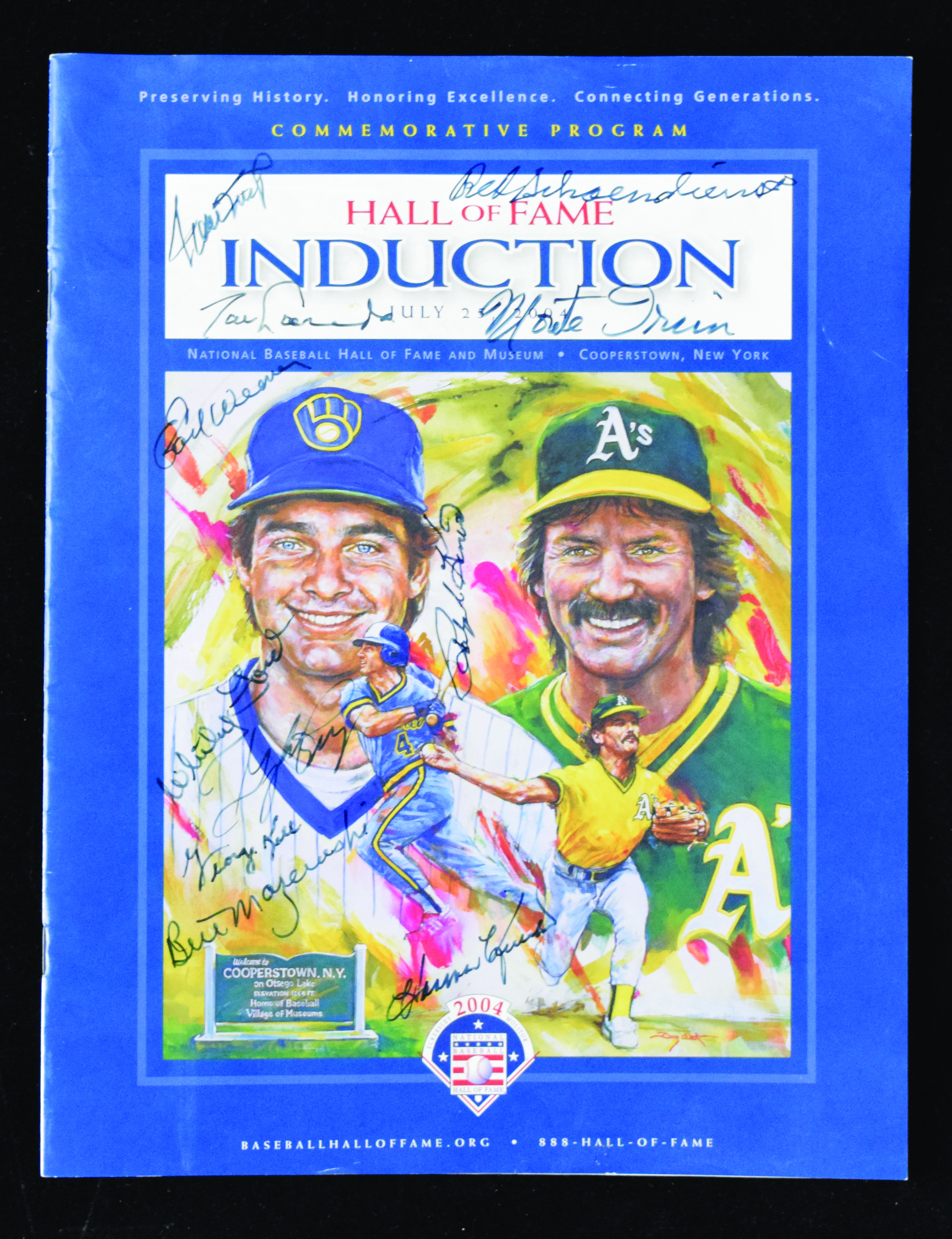 Description:2004 Hall of Fame Induction program autographed by (11) including Willie Mays (Sigs. EX/MT-NM, Program VG) Original program has been signed on the cover by Willie Mays, Tom Lasorda, Red Schoendienst, Monte Irvin, Earl Weaver, Whitey Ford, Ralph Kiner, Gaylord Perry, George Kell, Bill Mazeroski, and Harmon Killebrew. Marker signatures rate 7/8 to 8 out of 10. Mild handling wear. Includes certificate of provenance from the Willie Mays Collection: Sigs. EX/MT-NM, Program VG
