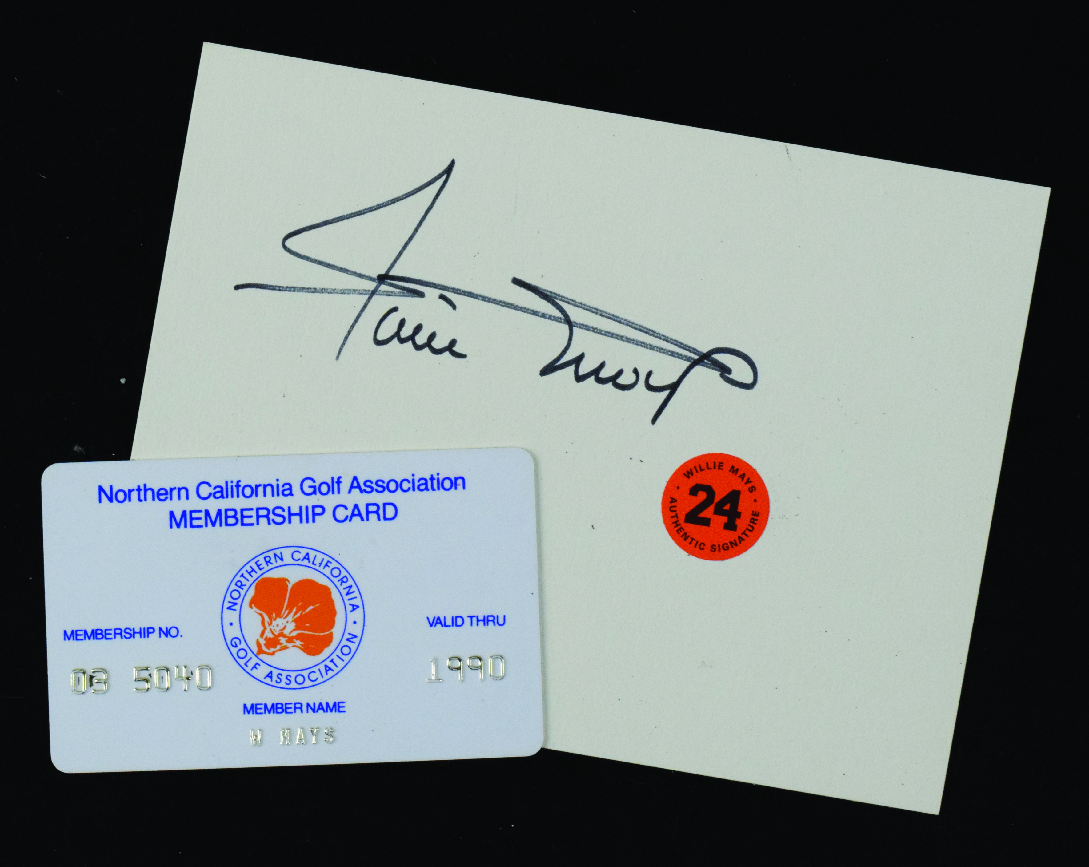 Description:Willie Mays Northern California Golf Association membership card with autograph (EX-NM) Includes slip of 4.5"x6" heavy stock paper signed "Willie Mays" in marker rating 8 out of 10. "Mays Authentic Signature" sticker affixed; his original membership card with "W Mays" name impressed. Some wear to membership card. Includes certificate of provenance from the Willie Mays Collection: EX-NM