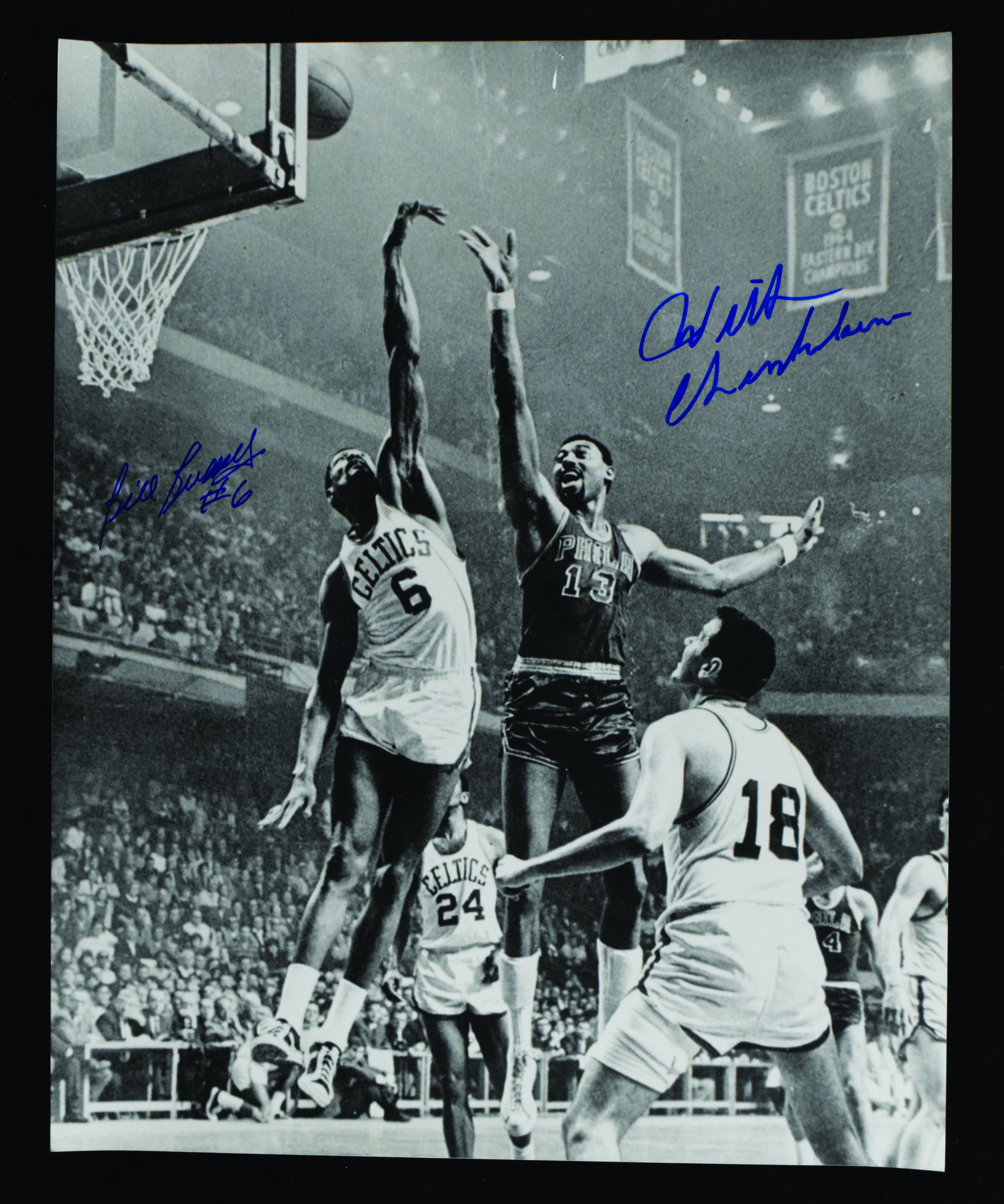 Description:Wilt Chamberlain & Bill Russell dual-signed 16"x20" photograph (PSA 10 auto grades). Chamberlain and Russell both signed the photo in blue marker. Includes full LOA from PSA/DNA grading both autographs 10. Small spot of minor surface wear near the top edge: EX/MT ($1,000-$2,000)