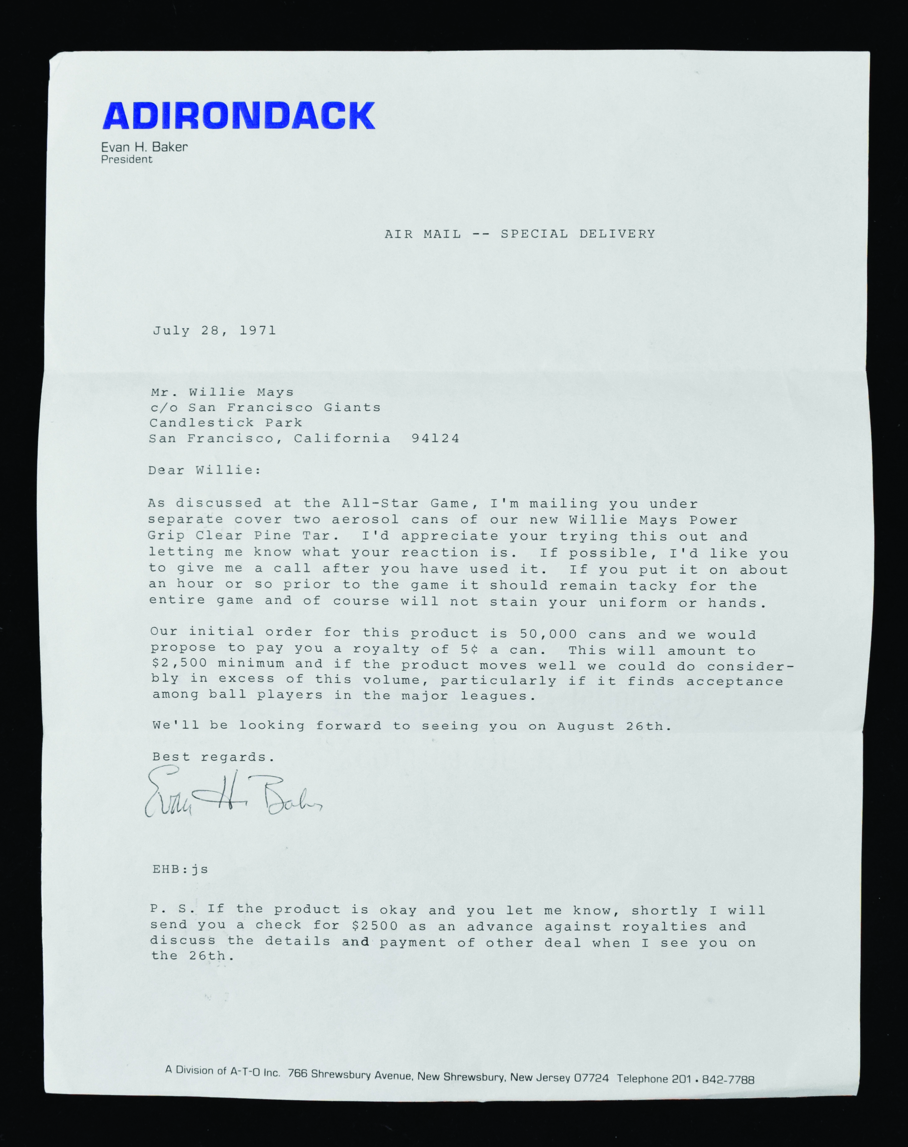 Description:1971 Adirondack letter to Willie Mays regarding "Mays..Pine Tar" (VG) July 1971 dated letter typed on Adriondack stationary as sent to Willie Mays care of the San Francisco Giants. Content reads in part, "As discussed at the All-Star Game, I'm mailing you under separate cover two aerosol cans on our new Willie Mays Power Grip Clear Pine Tar..." It goes on to discuss particulars of the product and proposed royalties to Mays along with anticipated sales. Fold lines and some other mild wear. Includes certificate of provenance from the Willie Mays Collection: VG