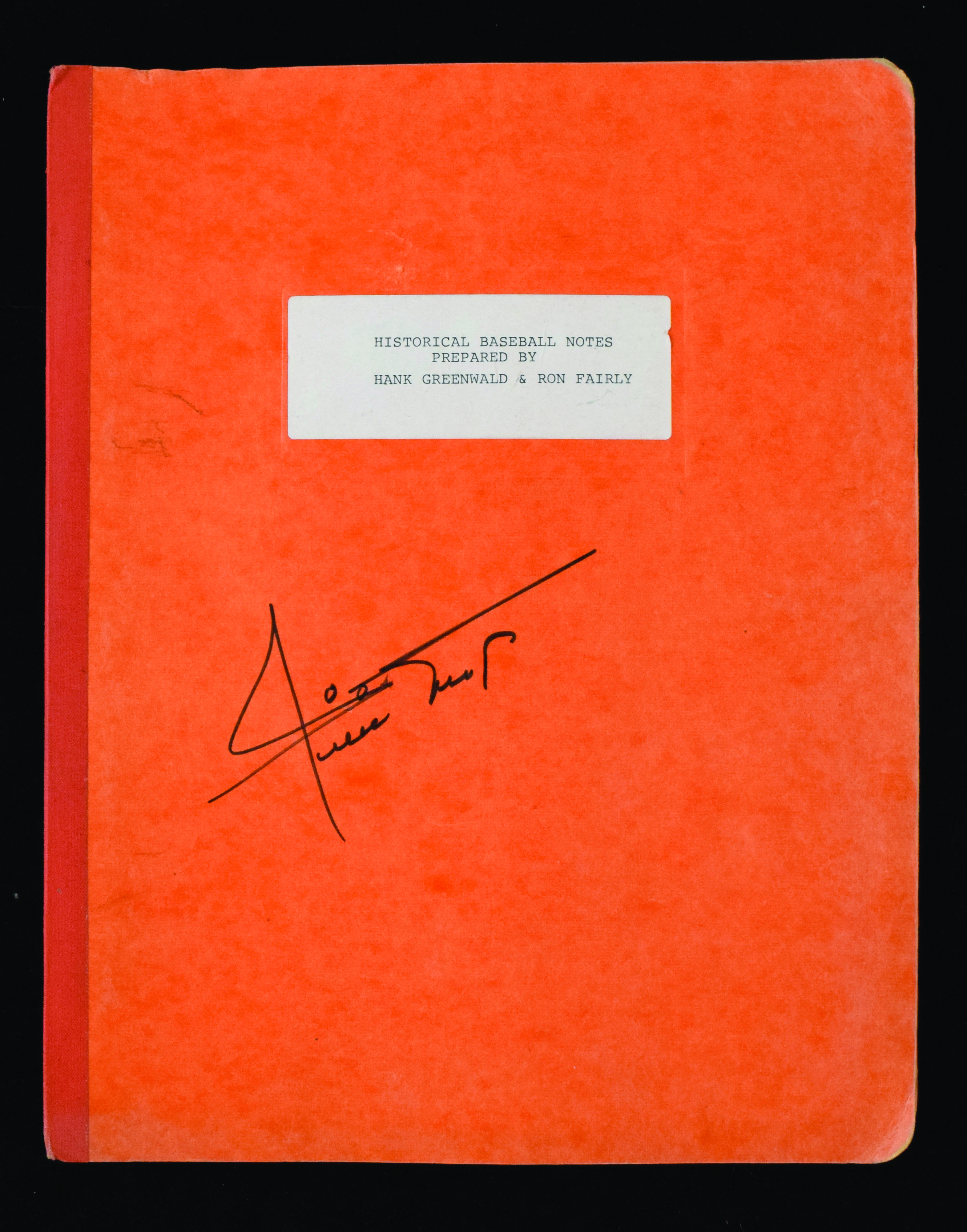 Description:Wlilie Mays autographed "Historical Baseball Notes" manuscript (VG-EX) Homemade typed manuscript bound in heavy stock covers with the front having affixed label that reads "Historical Baseball Notes Prepared By Hank Greenwald & Ron Fairly." Inside are many pages related to player stats and there are some stories. Mild handling and storage wear and some pages are folded over. Signed "Willie Mays" on the cover in marker rating 9 out of 10. Includes certificate of provenance from the Willie Mays Collection: VG-EX