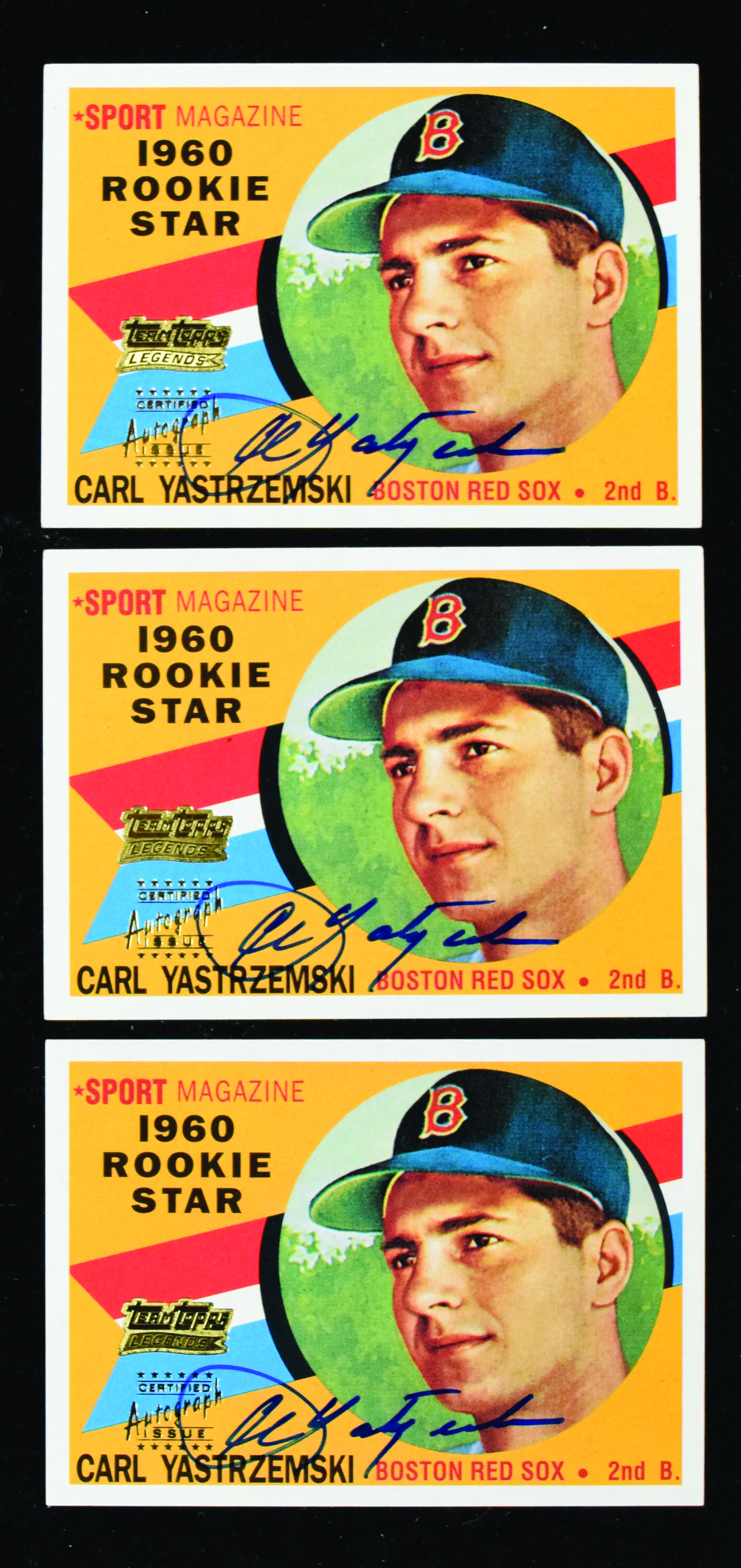 Description:Lot of (3) 2001 Topps Legends Carl Yastrzemski autographed retro Rookie cards (Sigs NM, Cards EX-EX/MT) Three retro cards issued by Topps in 2001 as part of the Team Topps Legends autographed insert series. Each is signed in marker rating 9 out of 10 or better. Touch of light wear: Sigs. NM, Cards EX-EX/MT