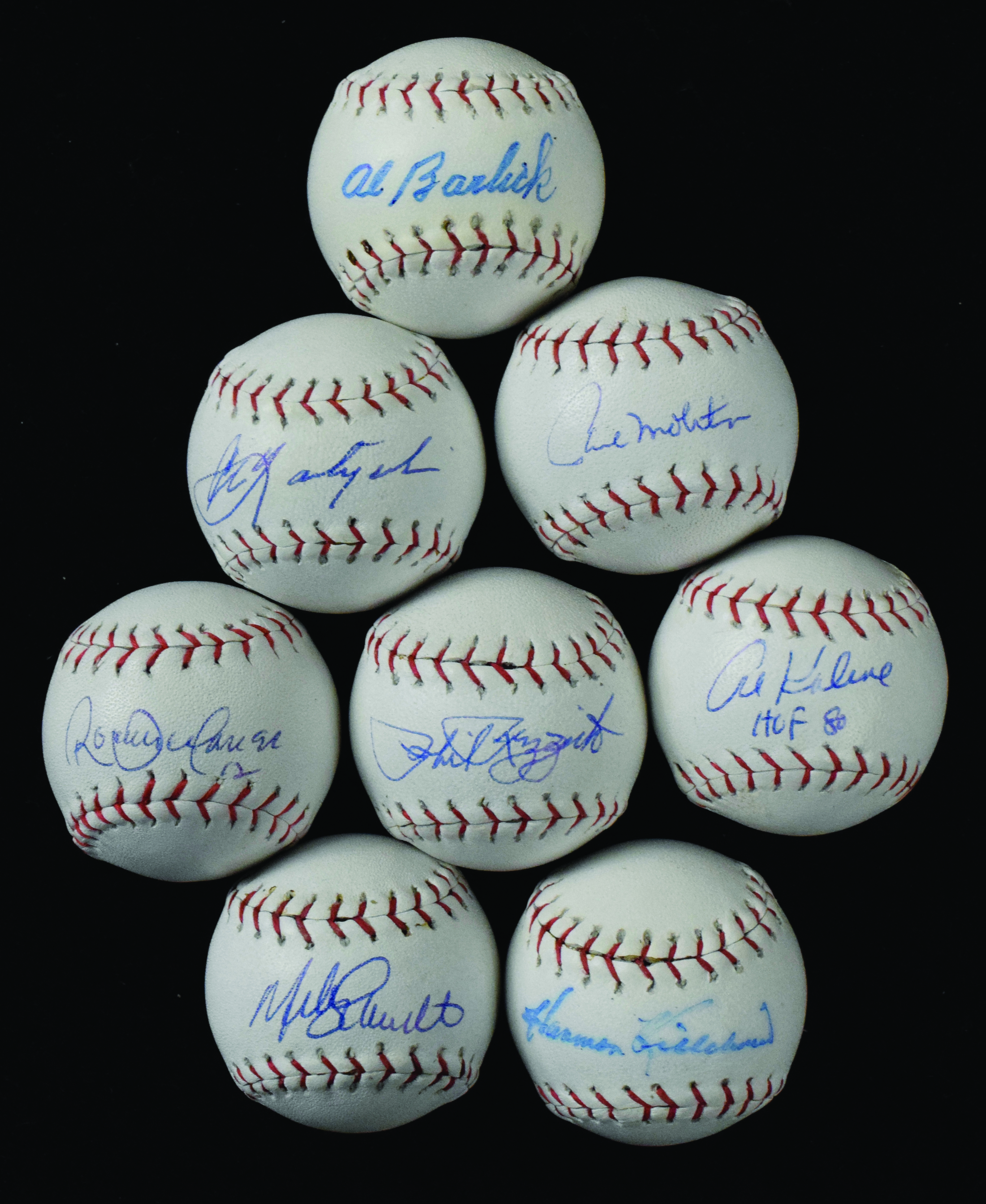 Description:Lot of (8) Hall of Famer signed miniature baseballs (EX-NM) Mini balls which are done in similar style to their full size counterparts complete with factory applied Rawlings and League President facsimile signature stampings. Includes Mike Schmidt, Carl Yastrzemski, Roberto Alomar, Paul Molitor, Harmon Killebrew, Al Barlick, Al Kaline, and Phil Rizzuto. Signatures rate 6 to 8 out of 10. Touch of light wear effecting stampings/markings on some: EX-NM