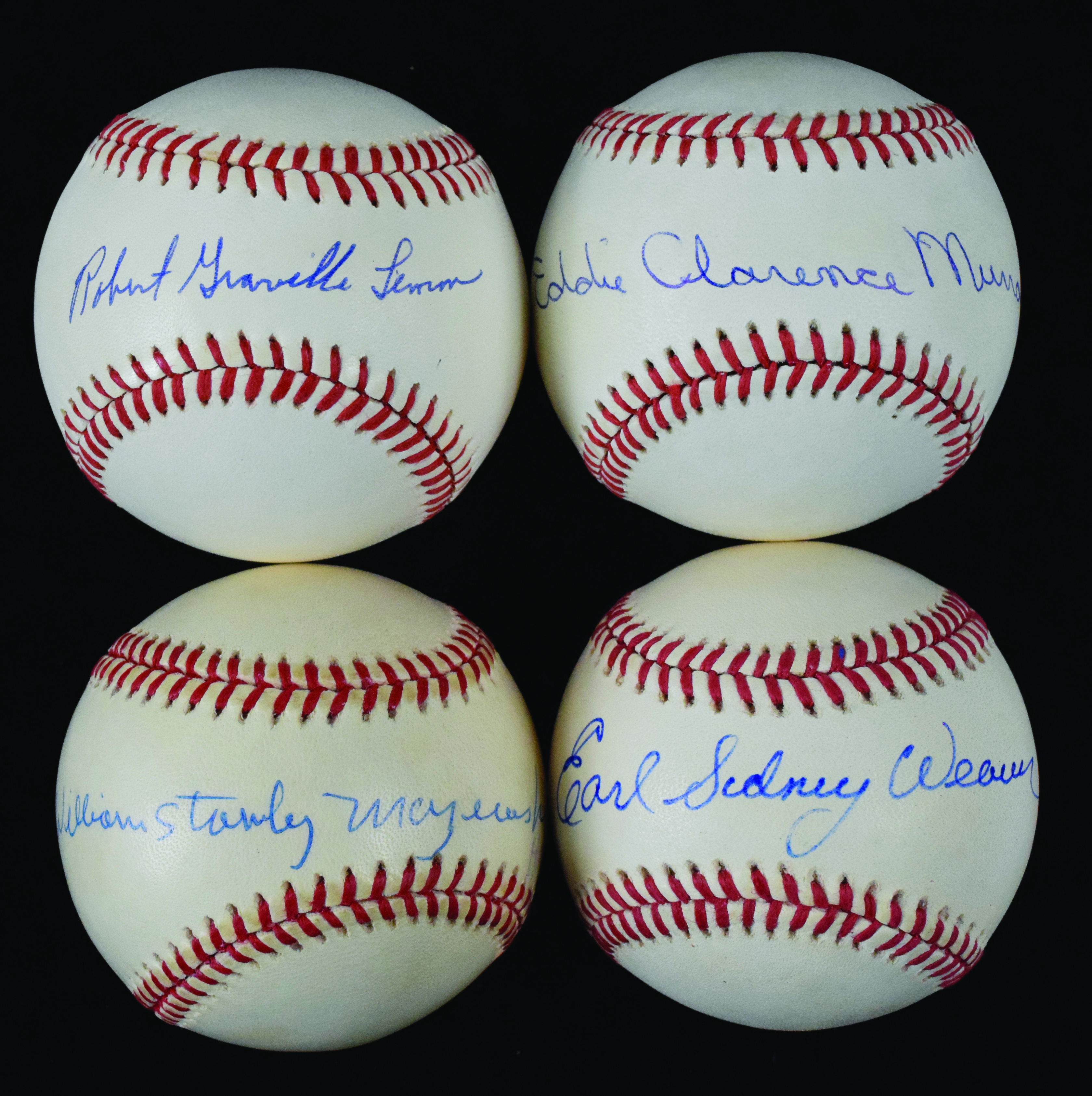 Description:Lot of (4) Hall of Famer full name single signed baseballs (EX-NM) Rawlings OAL/ONL/OML balls, each signed on the sweetspot with their full name includes Eddie Murray, Earl Weaver, Bill Mazeroski, and Bob Lemon. Signatures rate 8 out of 10 or better with Maz lesser and showing moderate toning: EX-NM