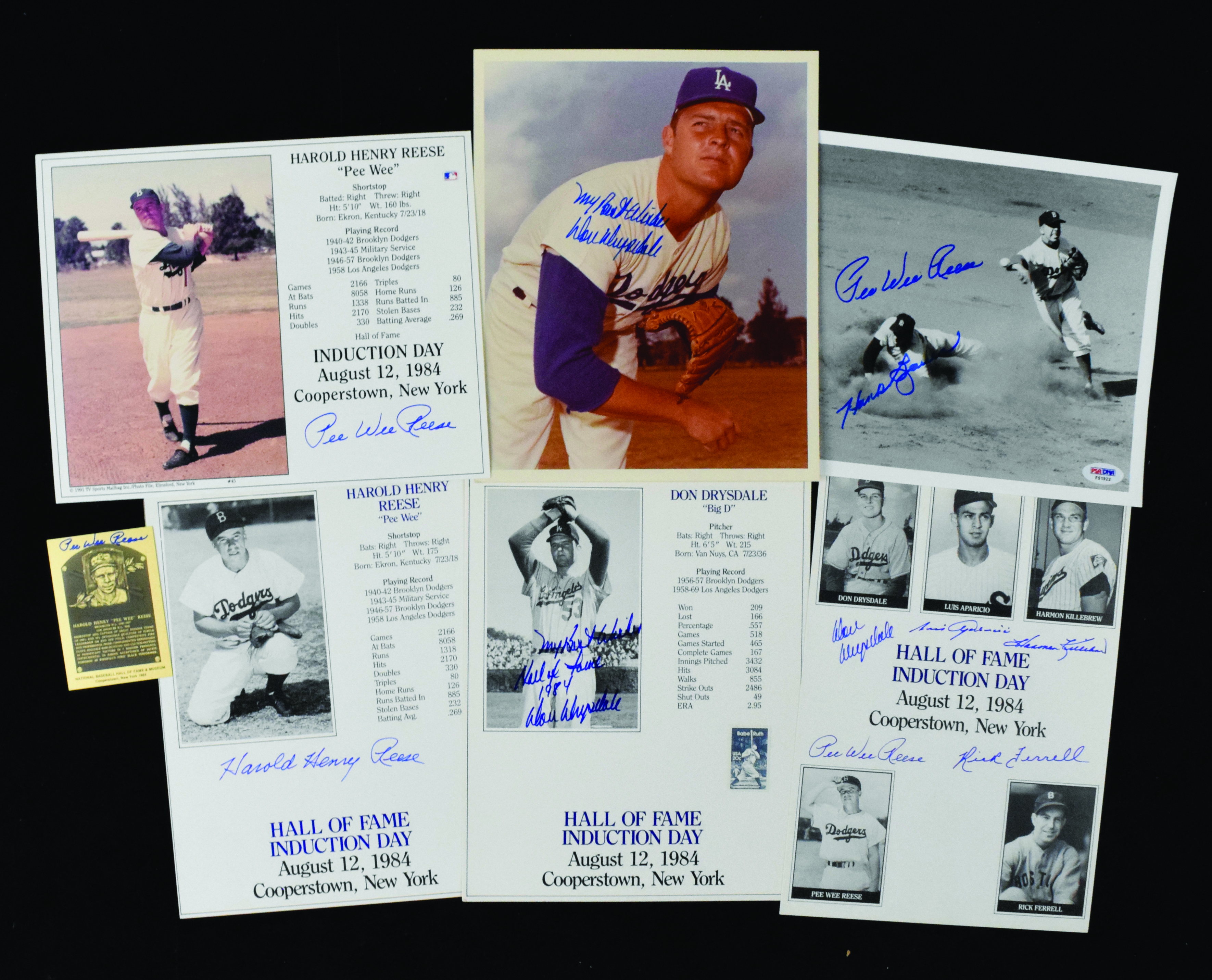 Description:Nice lot of Pee Wee Reese and Don Drysdale autographs incl. 1984 HOF Class photo (EX-NM) Includes 7.5"x10.5" print signed by the 1984 Hall of Fame Induction Class including Reese, Drysdale, Luis Aparicio, Harmon Killebrew, and Rick Ferrell; 8.5"x11" stat card/photos signed "Harold Henry Reese", "Pee Wee Reese", and "My Best Wishes, Hall of Fame 1984, Don Drysdale"; Drysdale signed 8"x10" photo; Reese and Hank Bauer signed 8"x10" photo (PSA COA); and an index card and metal Hall of Fame plaque card signed by Reese. Ink and marker signatures rate 8 to 10 out of 10: EX-NM
