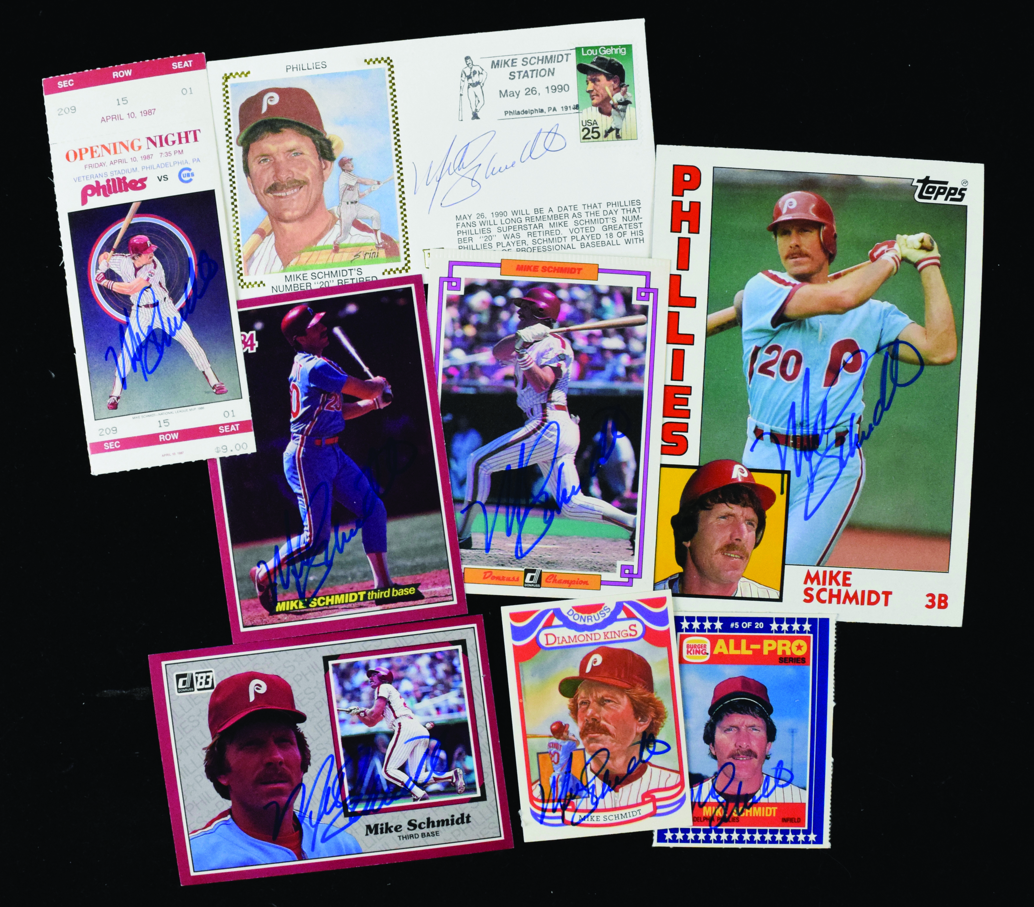 Description:Lot of (8) Mike Schmidt autographed pieces (EX-NM, 1 lesser) Includes commemorative postal cover; 1987 Phillies Opening Night full ticket; 1986 Burger King All-Pro card; 1983 Donruss Diamond Kings card; 1984 Topps Giants card; and (3) oversized trading cards issued by Donruss in the 1980s (one of these has crimp marks along the top edge from when the pack it was in was sealed. Marker signatures rate 8 to 9 out of 10. Hint of light wear: EX-NM, 1 lesser