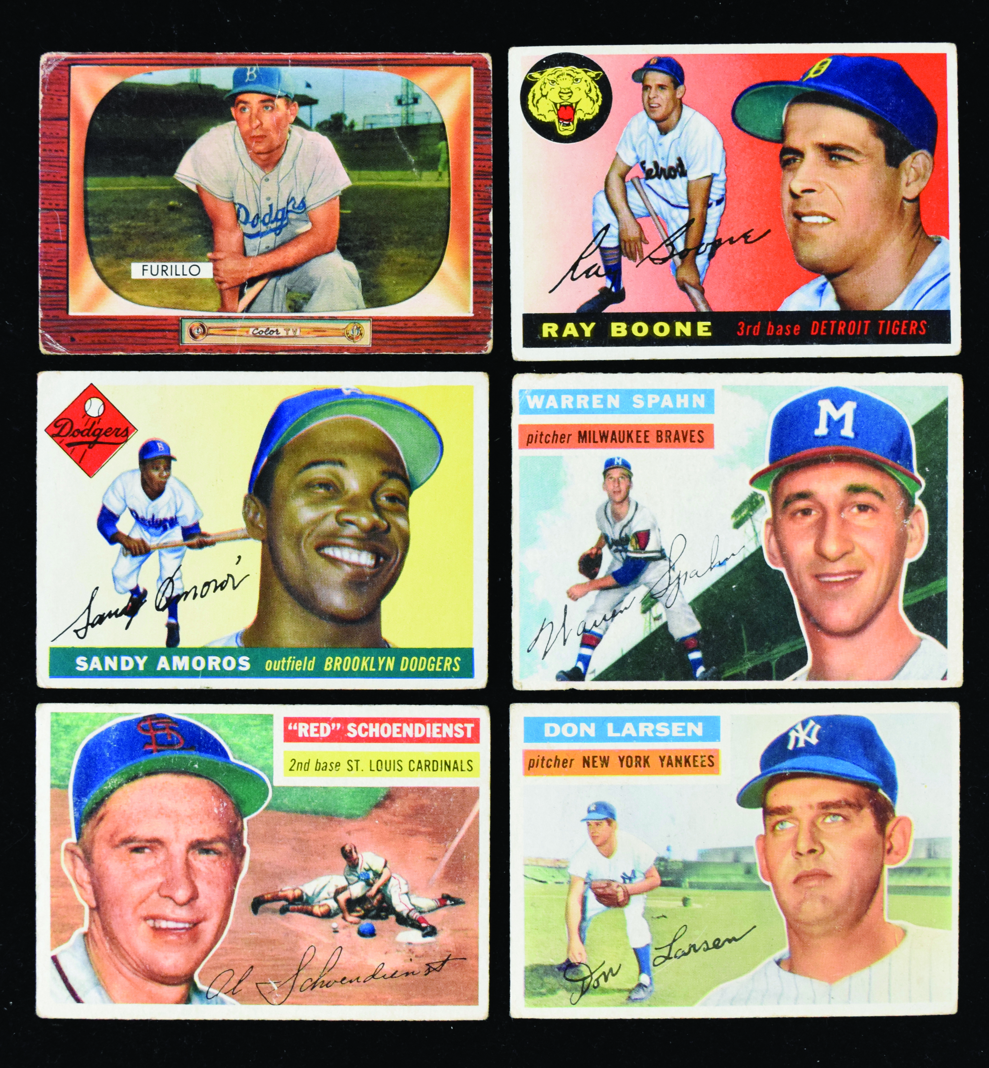 Description:Binder of (117) 1955 & 1956 Topps and Bowman cards with HOFers (PR-VG/EX). Lot (with light duplication) includes commons and minor stars with a few Hall of Famers sprinkled around. Includes (28) 1955 Topps; (24) 1955 Bowman and (65) 1956 Topps, highlighted by #s 10 Warren Spahn white back, 165 Red Schoendienst gray back, 332 Don Larsen, and 208 Elston Howard. Most cards appear GD-VG with some better and some worse. Range: PR-VG/EX.