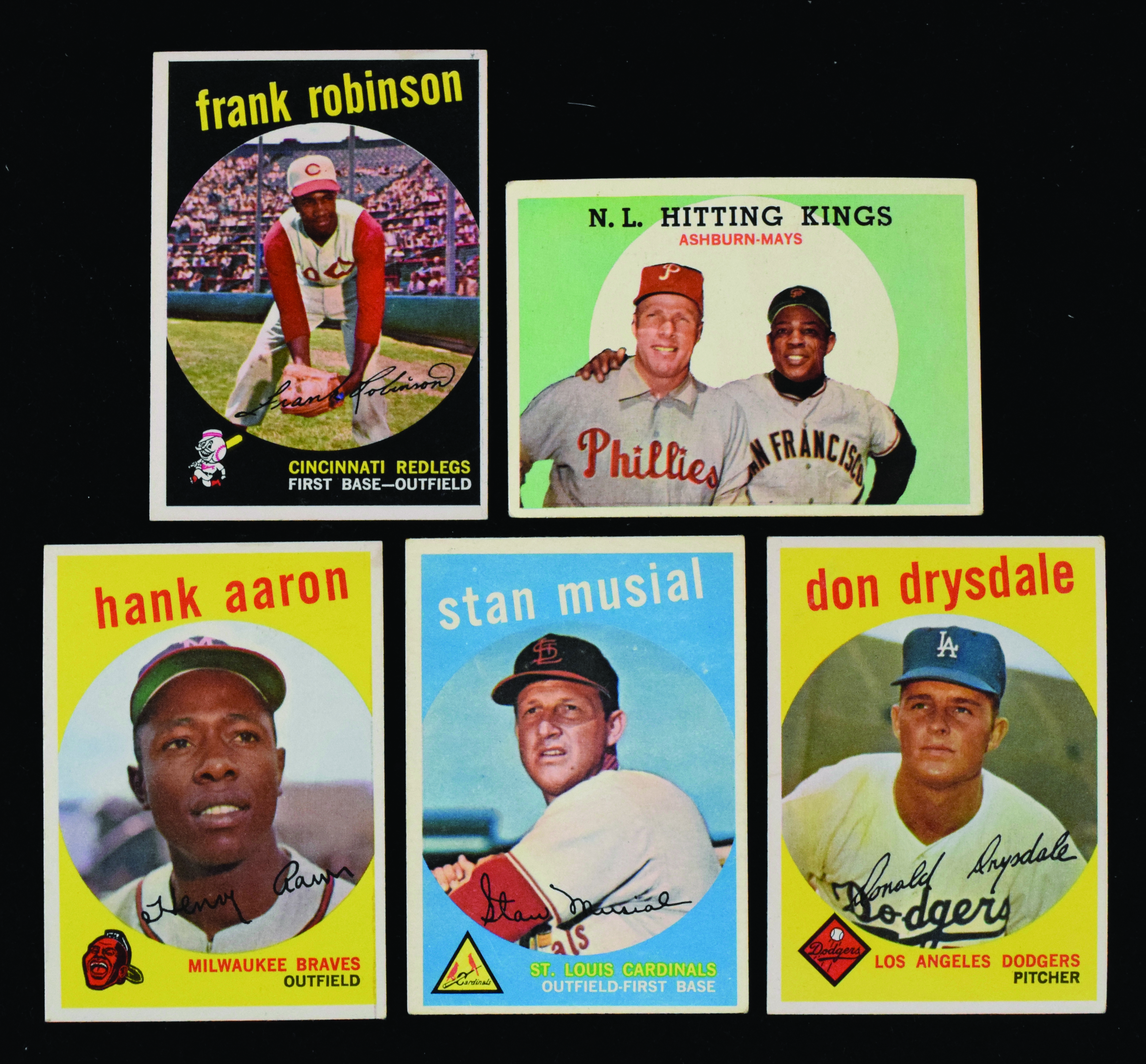 Description:Lot of (5) 1959 Topps HOFers, with Aaron, Musial and Robinson (FR-VG/EX). Nice assortment of Hall of Famers from the 1959 Topps set, with #s 150 Stan Musial (VG/EX), 380 Hank Aaron (GD; stain on reverse), 317 Richie Ashburn/Willie Mays (VG+), 387 Don Drysdale (FR) and 435 Frank Robinson (GD; stain on reverse). Range: FR-VG/EX.
