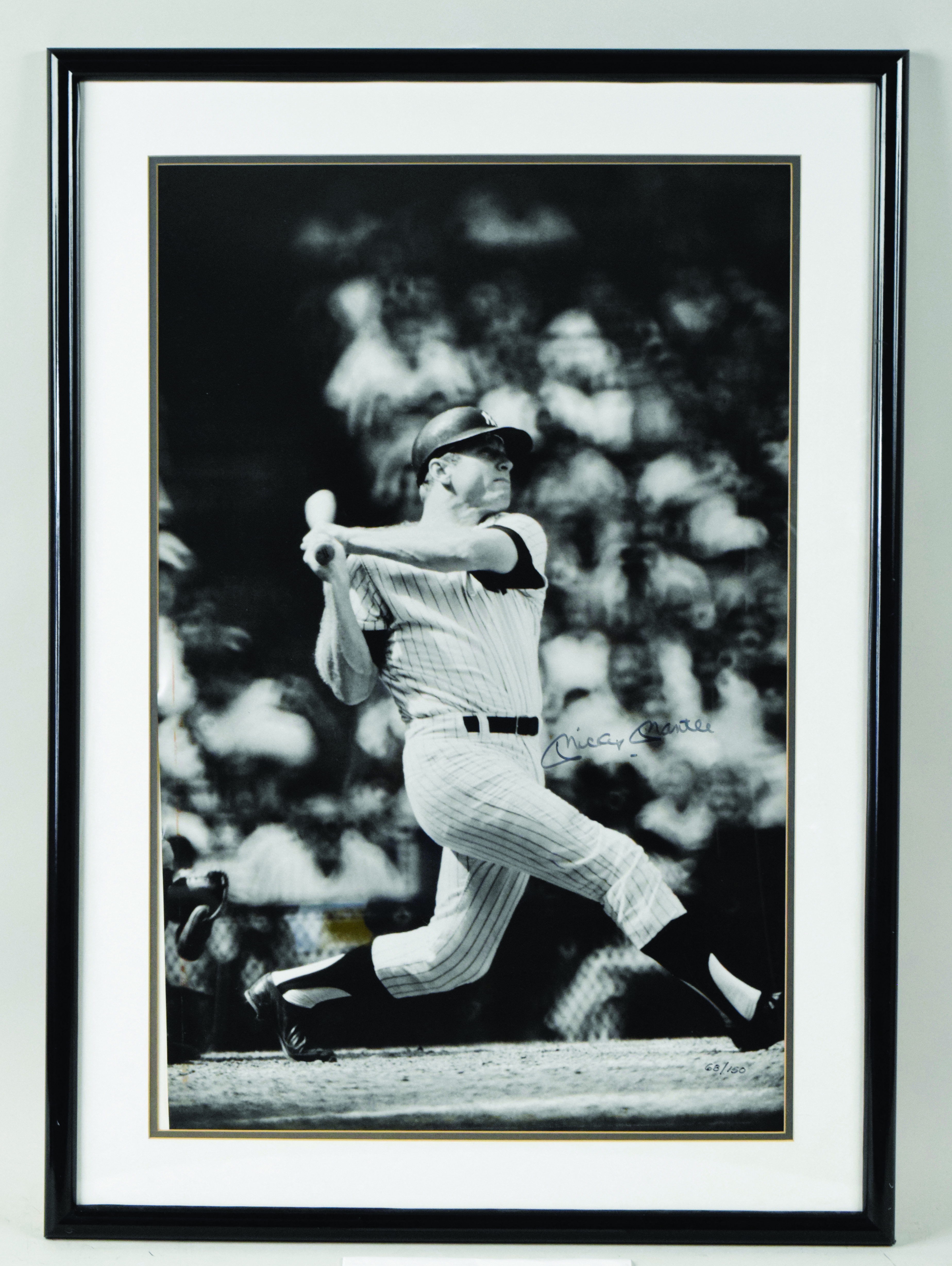 Description:Mickey Mantle autographed limited edition oversize framed photograph - PSA/DNA (EX/MT). Frame measures approx. 25.5"x35.5". Mantle signed the photo in black marker. Signature rates 7/8 out of 10. Includes full LOA from PSA/DNA. The photo is #ed 68/150. Due to framing, complete condition is unknown, but light staining can be seen at the left edge where that side has come loose from the matting (could likely be re-matted with stain out of view for a NM appearance). ($500-$750)
