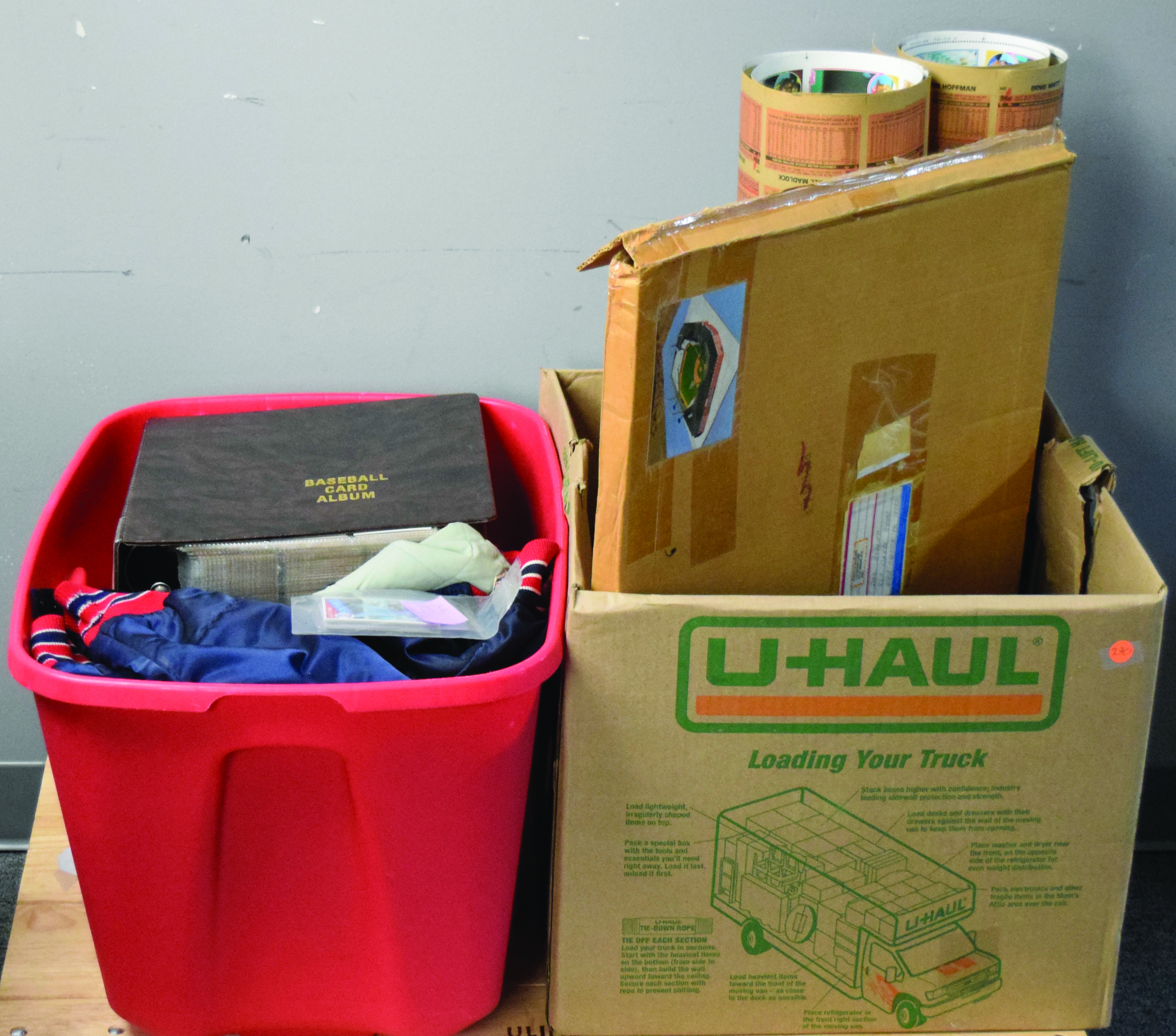Description:Lot of (7,500+) 1983-1989 Topps cards with RCs and complete sets, plus memorabilia (EX/MT-NM/MT). Lot includes approx. (5,000) 1983-1989 Topps cards, including (1,000+) 1984 Topps cards with stars and #8 Don Mattingly RC and (1,000+) 1985 Topps cards with stars and (3) #401 Mark McGwire RC, (3) #181 Roger Clemens RC and (3) #536 Kirby Puckett RCs. Also includes (6) binders with 1986, 1987 and 1988 complete sets, 1985 Pete Rose official set, and misc. cards including 1988 Toys 'R Us and 1984 Glossy All-Stars, plus (2) 1983 Topps uncut sheets with (132) cards each, including stars. Also included is (1) c. 1980s Bauer Diamonds Fenway Park "Do It Yourself" cardboard stadium display (unassembled; new in box); and (1) c. 1980s Boston Red Sox warm-up jacket with "McAuliffe Uniform Corp." tag in the collar, size 4C with no additional markings (EX/MT). Most cards appear NM-NM/MT or better and memorabilia ranges EX/MT-NM.