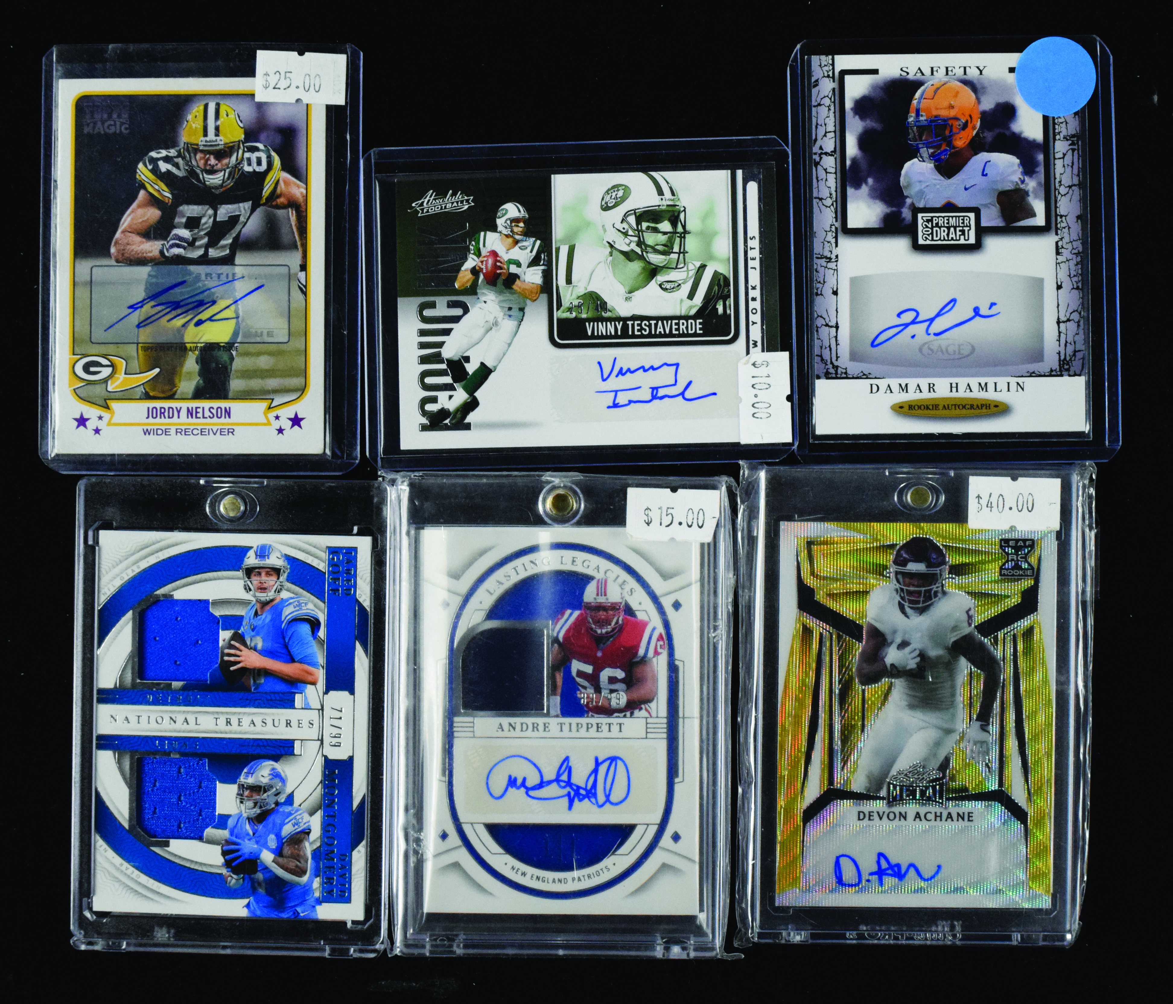 Description:Lot of (31) modern football certified autograph and game-used relic cards (MT). Lot of modern football cards includes (29) certified autograph cards (pack-pulled) and (2) relic cards from brands including Leaf Certfied, Panini and Topps, with some serial-numbered and others also with game-used swatches. Signers include Andre Tippett, Blake Corum, Vinny Testaverde, Elijah Moore, Jordy Nelson, Jordan Mathews, Jaylen Wrighty, Mecole Hardman, Jamal Haynes, Johnny Robinson, Chuck Foreman, Devon Achane, Damar Hamlin, Duce Staley and more. Also includes (2) game-used/relic (non-autographed cards), with Jared Goff and Josh Allen. Signature rate 9 out of 10, and cards appear MT.