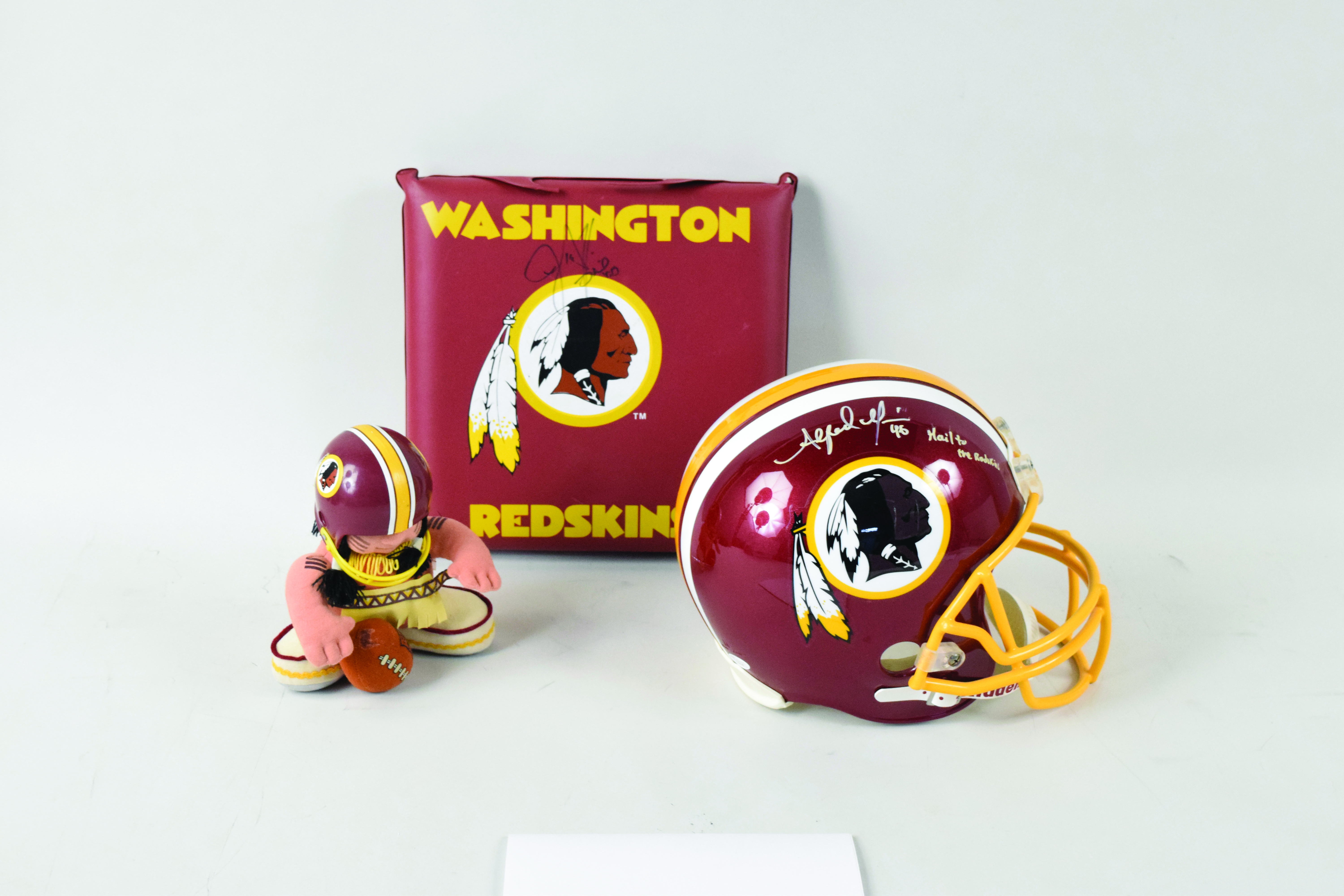 Description:Small group of Redskins memorabilia, including Alfred Morris signed helmet (Sigs. NM/MT). Lot of assorted Washington Redskins memorabilia includes (1) Riddell replica helmet signed by Alfred Morris with "Hail to the Redskins" inscription and JSA authentication sticker affixed; (1) SGA Redskins logo seat cushion signed by Patrick Ramsey and one unknown signer; and (1) one Redskins mascot mini-doll (not signed). Signatures rate 8 out of 10, and items range EX/MT-NM.