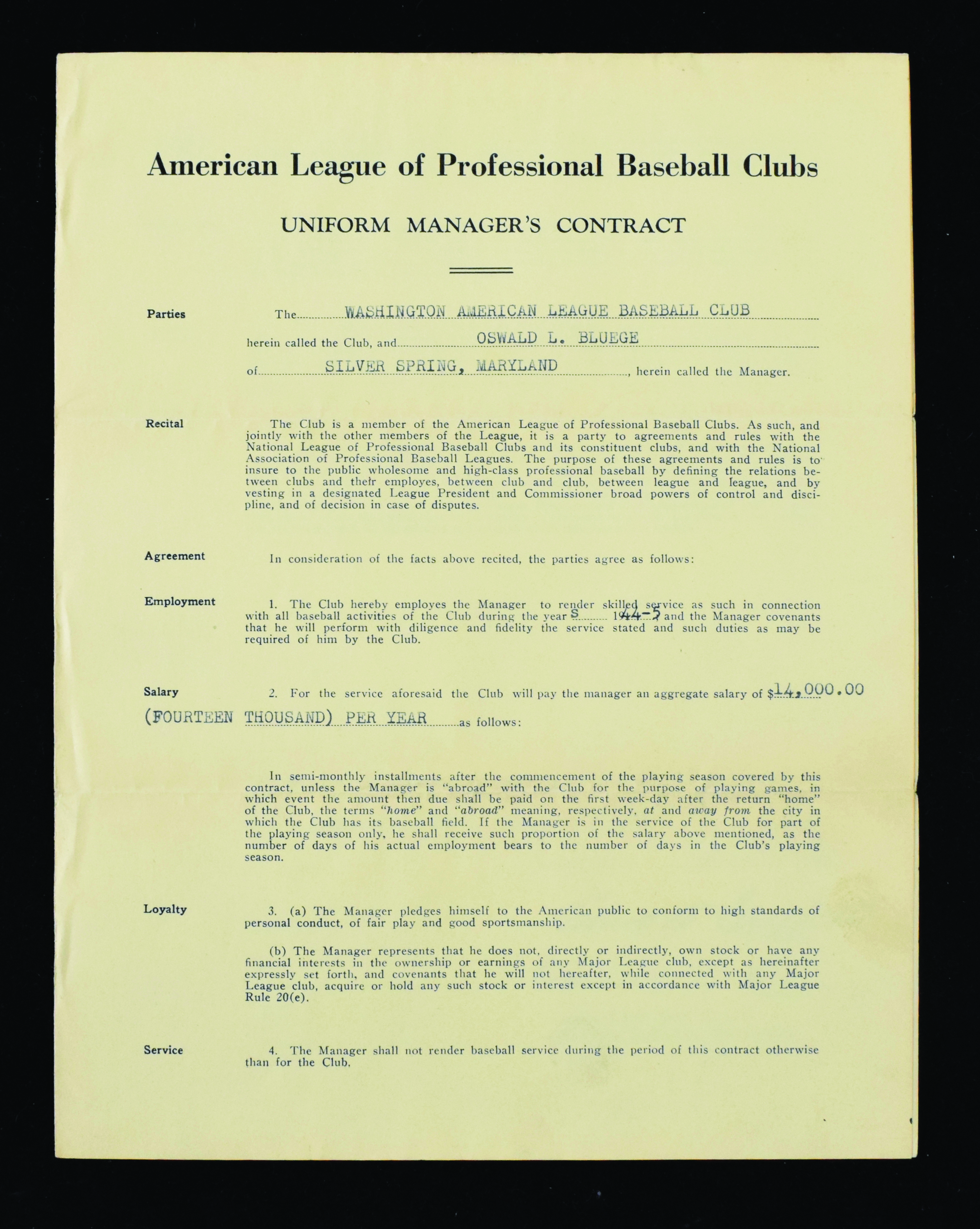 Description:1944-45 Ossie Bluege Senators contract signed by Griffith and Harridge (VG) Original players contract is signed by Ossie Bluege, Clark Griffith, and William Harridge. Fountain pen signatures rate 8 to 9 out of 10. Mild handling and storage wear: VG