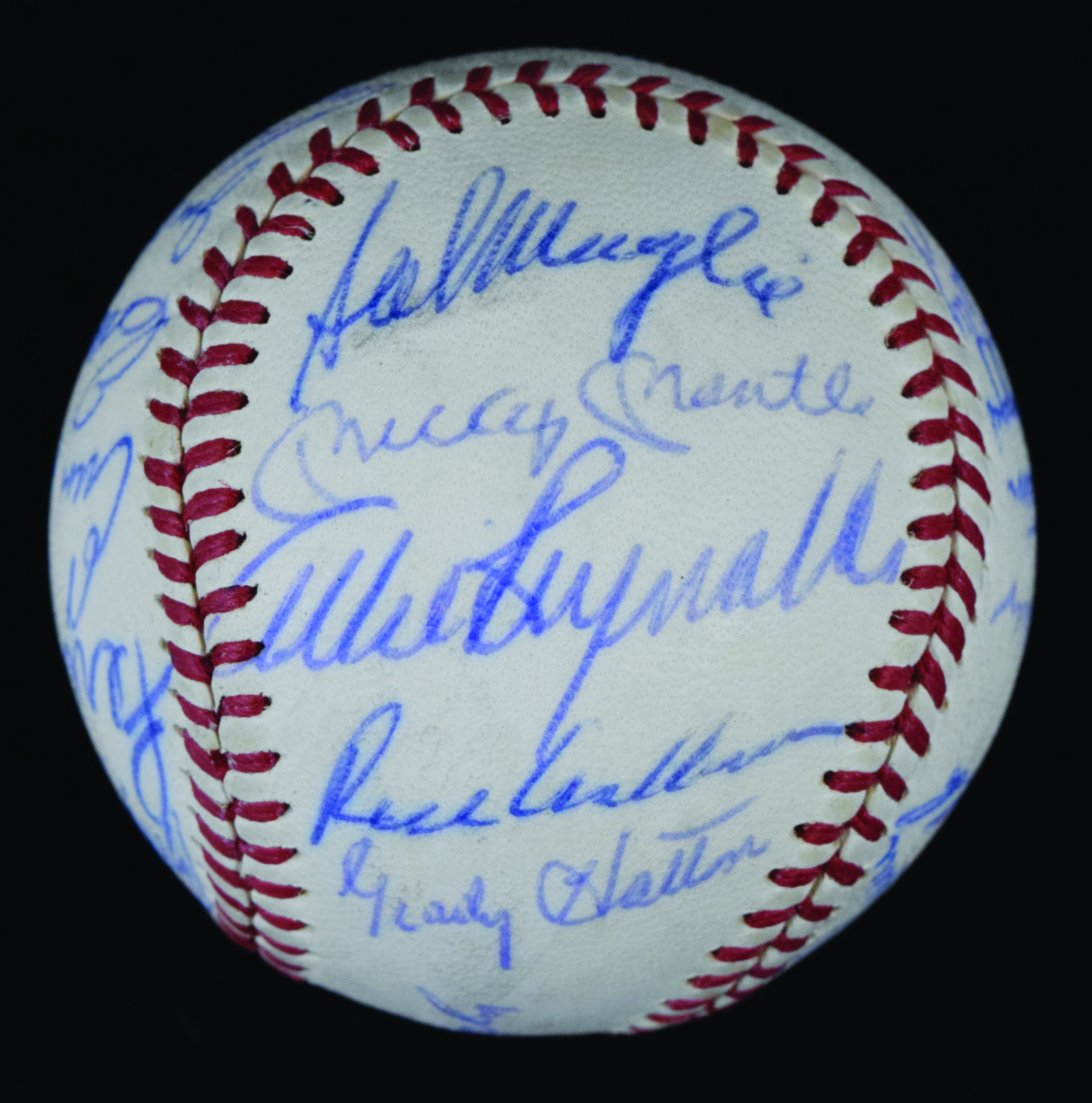 Description:High grade old timers multi-signed baseball with Mantle & other HOFers, c.early-mid 1970s (NM). C.Feeney NL ball signed by (22) including Mickey Mantle, Richie Ashburn, Robin Roberts, Pee Wee Reese, Enos Slaughter, Carl Furillo, Hank Sauer, Jackie Jensen, Allie Reynolds, Ed Yost, Bobby Shantz, Curt Simmons, Bob Avila, Sal Maglie, Grady Hatton, Wes Westrum, Dom DiMaggio, Jerry Staley, Bob Rush, Ferris Fain, Eddie Joost, and Joe Astroth. Signatures rate 7/8 to 9/10 out of 10: NM ($750-$1,000)