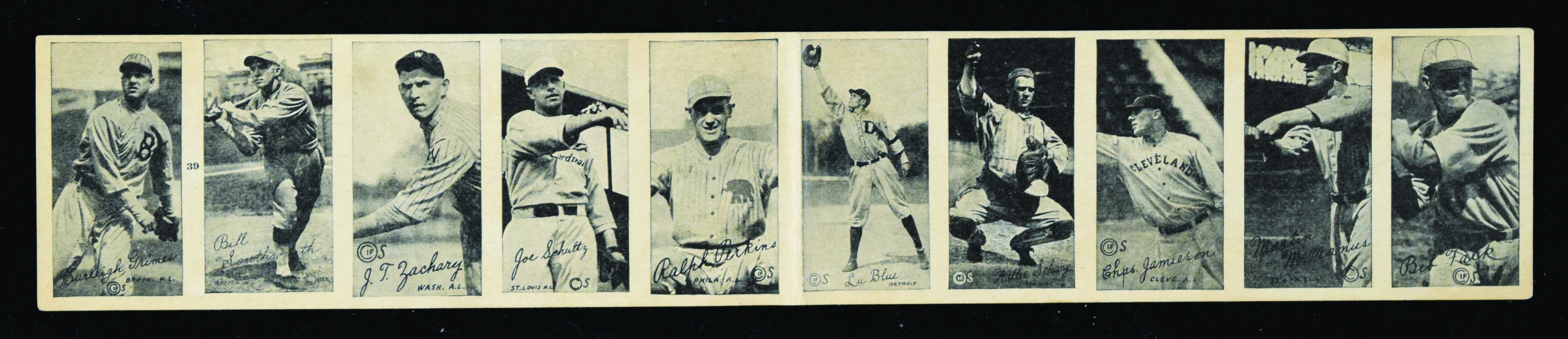 Description:1923 W572 Strip Cards - uncut strip of (10) with Southworth and Grimes (GD) Uncut strip (2.5"x13.5") of (10) cards from the W572 series with notables including Hall of Famers Burleigh Grimes and Billy Southworth. Others include Tom Zachary, Wally Schang, and Bibb Falk. Some light general wear with the most notable flaw being a vertical crease which primarily effects the Lu Blue card: GD