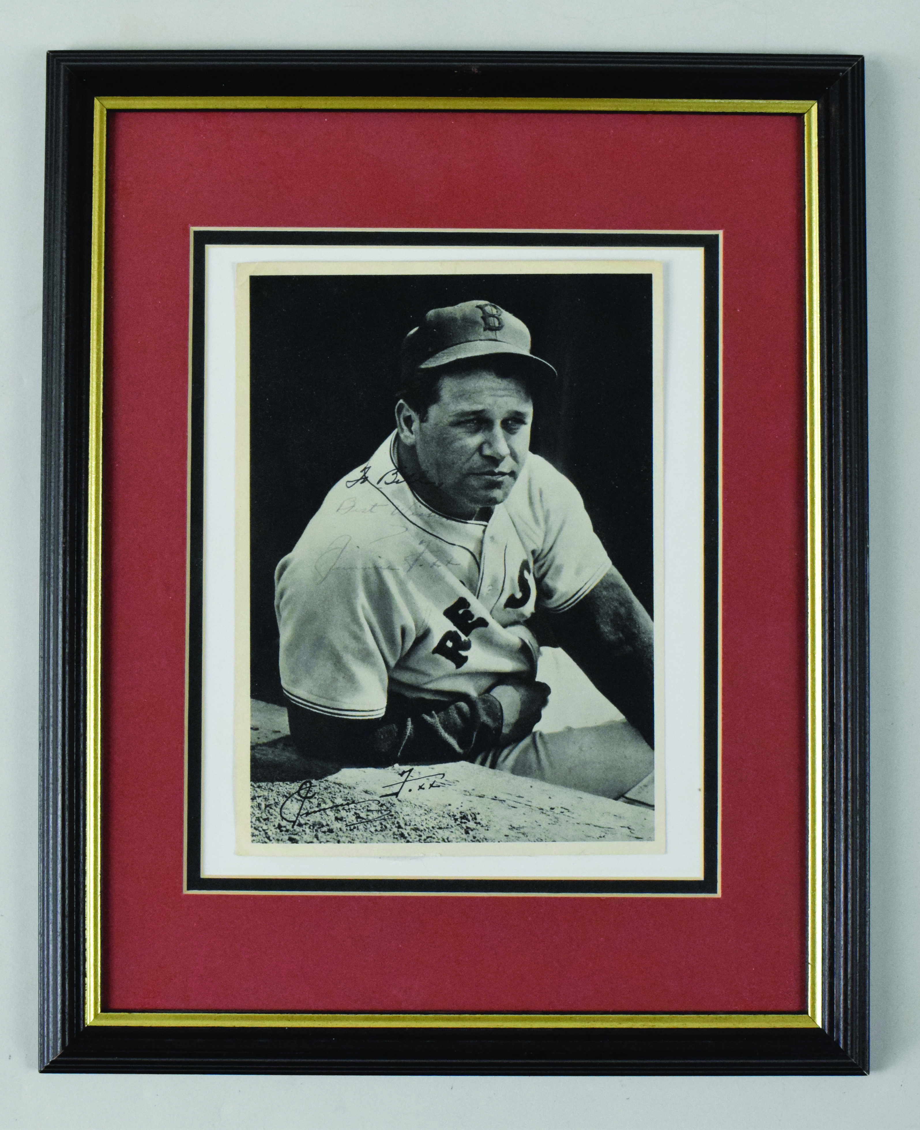 Description:Jimmie Foxx signed photograph - PSA/DNA (EX framed). 12.5"x15.5" frame containing 6.5"x9" photo signed by Foxx in vintage black fountain pen (personalized to Bill). Signature rates 6/7 out of 10. Includes full LOA from PSA/DNA. Due to framing, complete condition is unknown, but a minor crease can be seen at the top left corner: EX appearance ($500-$750)