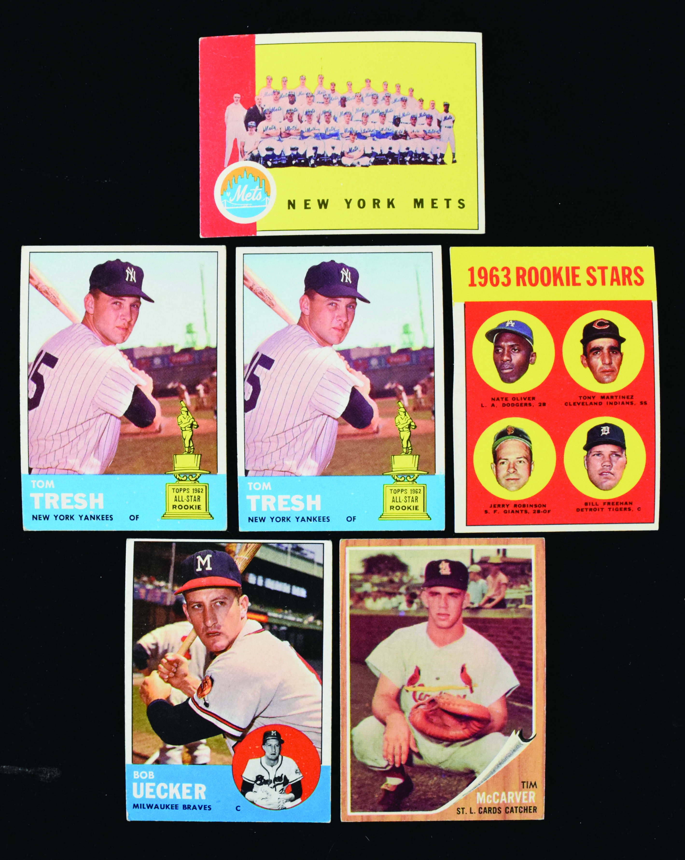 Description:Lot of (250+) 1959-1963 Topps cards with most 1963, including Freehan RC & (2) Tresh (PR-EX). Lot includes (36) 1959 Topps commons (PR-GD overall; (24) 1962 Topps mostly commons and #167 Tim McCarver RC (VG-VG/EX overall); and approx. (200) 1963 Topps cards (VG/EX overall with duplication, semi-high and high numbers), highlighted by #s 466 Bill Freehan RC, 126 Bob Uecker, 473 Mets team card, (2) 470 Tom Tresh SP, 445 Norm Cash and more. Range all cards: PR-EX.