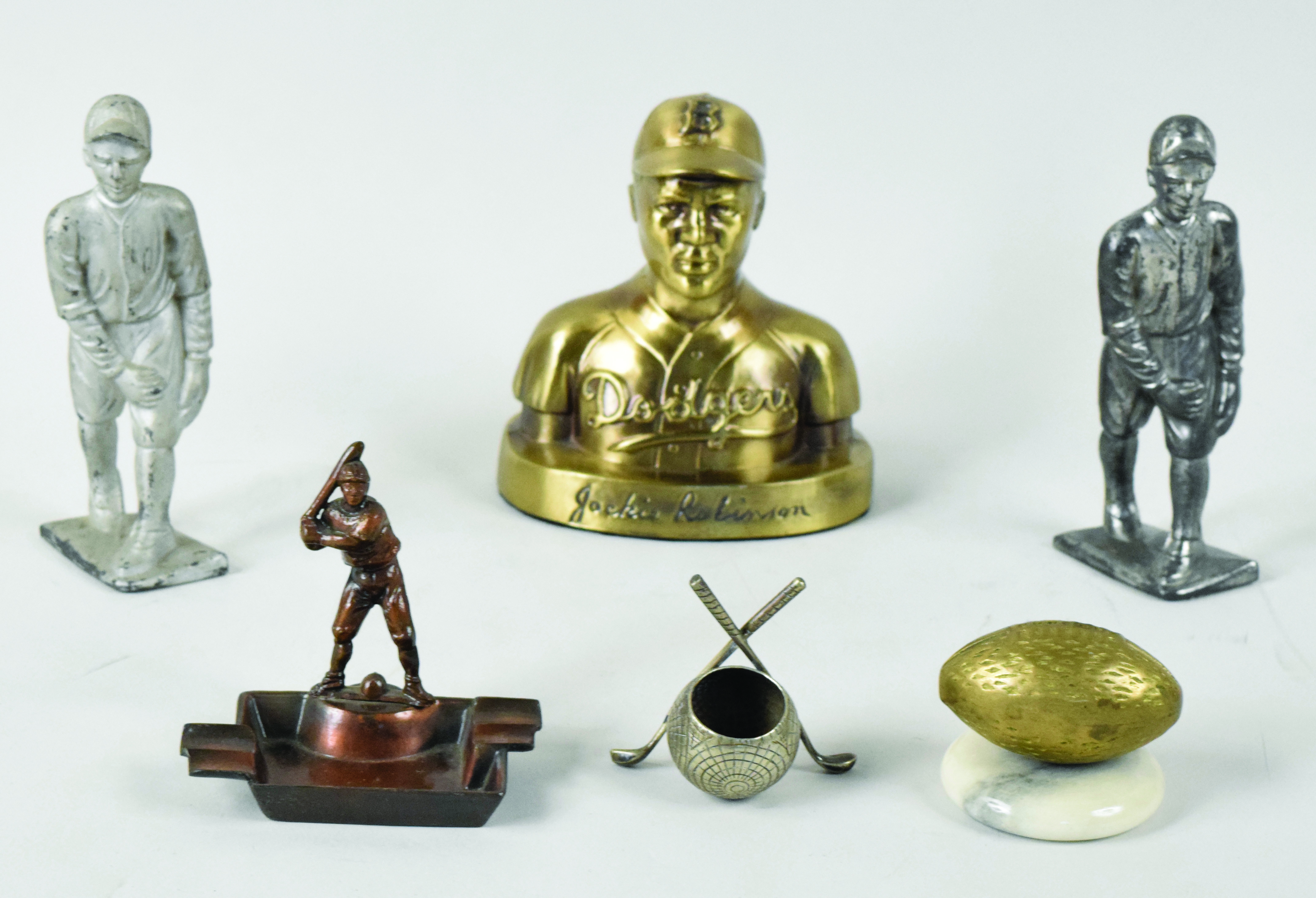 Description:Lot of (6) small baseball, football and golf display pieces, c. 1940s-60s (VG/EX-NM). Eye-catching assortment of display pieces (all without markings) includes (1) 3" crossed golf club matchstick holder; (1) 6" Jackie Robinson bust coin bank; (1) 2" football with marble base; (1) 4" baseball figural ashtray and (2) 6" baseball figural statue. Range: VG/EX-NM.