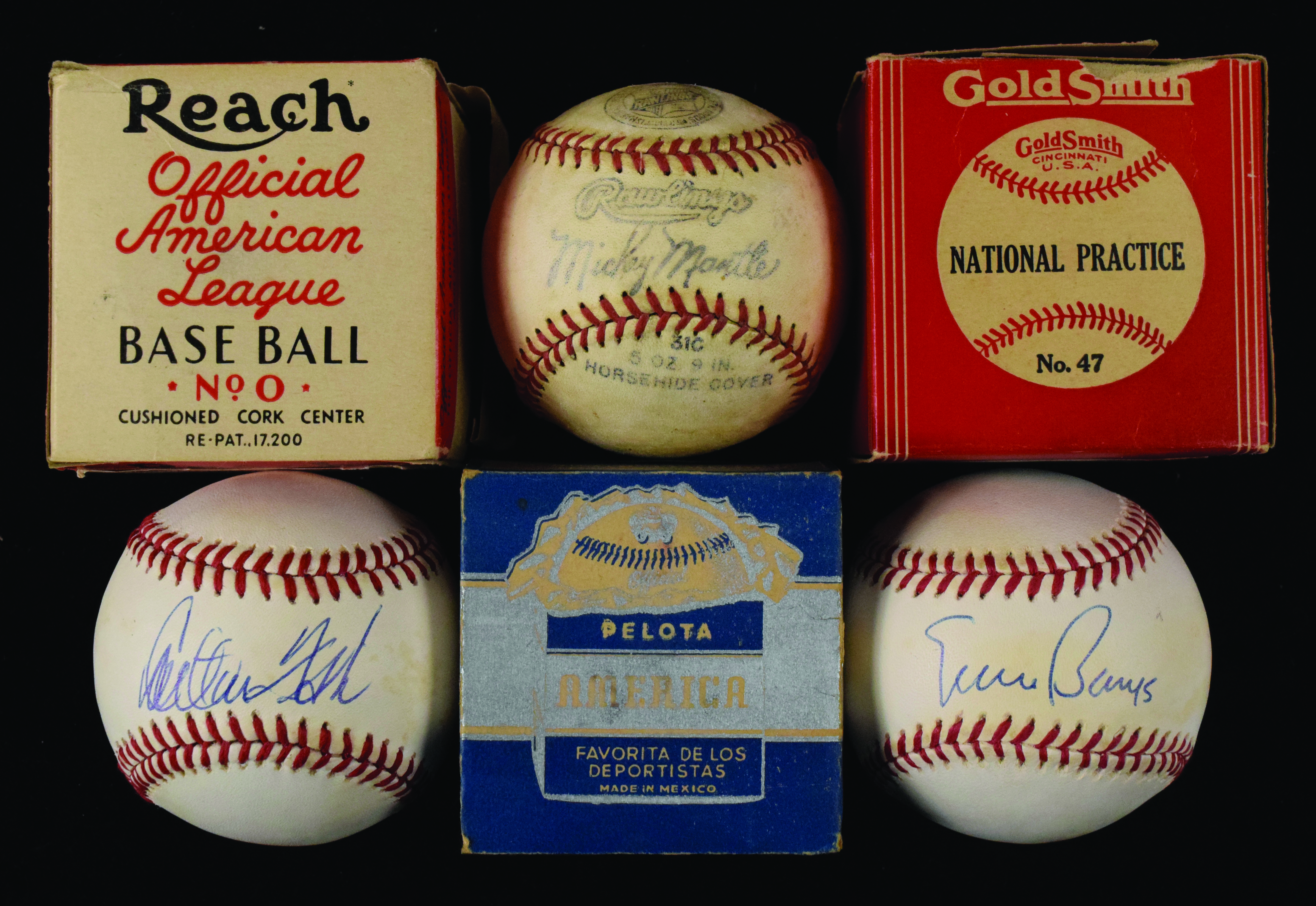 Description:Collection of (17) baseballs and vintage empty boxes with Reach, Goldsmith and autos (GD-EX/MT). Lot includes (6) c. 1950s-1960s empty baseball boxes, with one each of Reach No. 0, Goldsmith No. 47, Wilson (missing lid), Spalding, Pelota America, and One Official League; (3) autographed baseballs, with (1) L. Coleman N.L. ball signed by Ernie Banks; (1) B. Brown A.L. ball signed by Carlton Fisk and (1) G. Budig A.L. ball signed by Willie Blair (personalized); (7) 1960s misc. baseballs (non-autographed or with printed signatures) with (3) Rawlings Steve Carlton Official League; (2) Rawlings Mickey Mantle Official League and (1) Wilson Youth Official League and (1) Rawlings Dal Maxvill Offical League. Also includes (1) Rawlings softball in orignal box (missing lid). Signatures rate 8/9 out of 10, and boxes/balls range GD-EX/MT