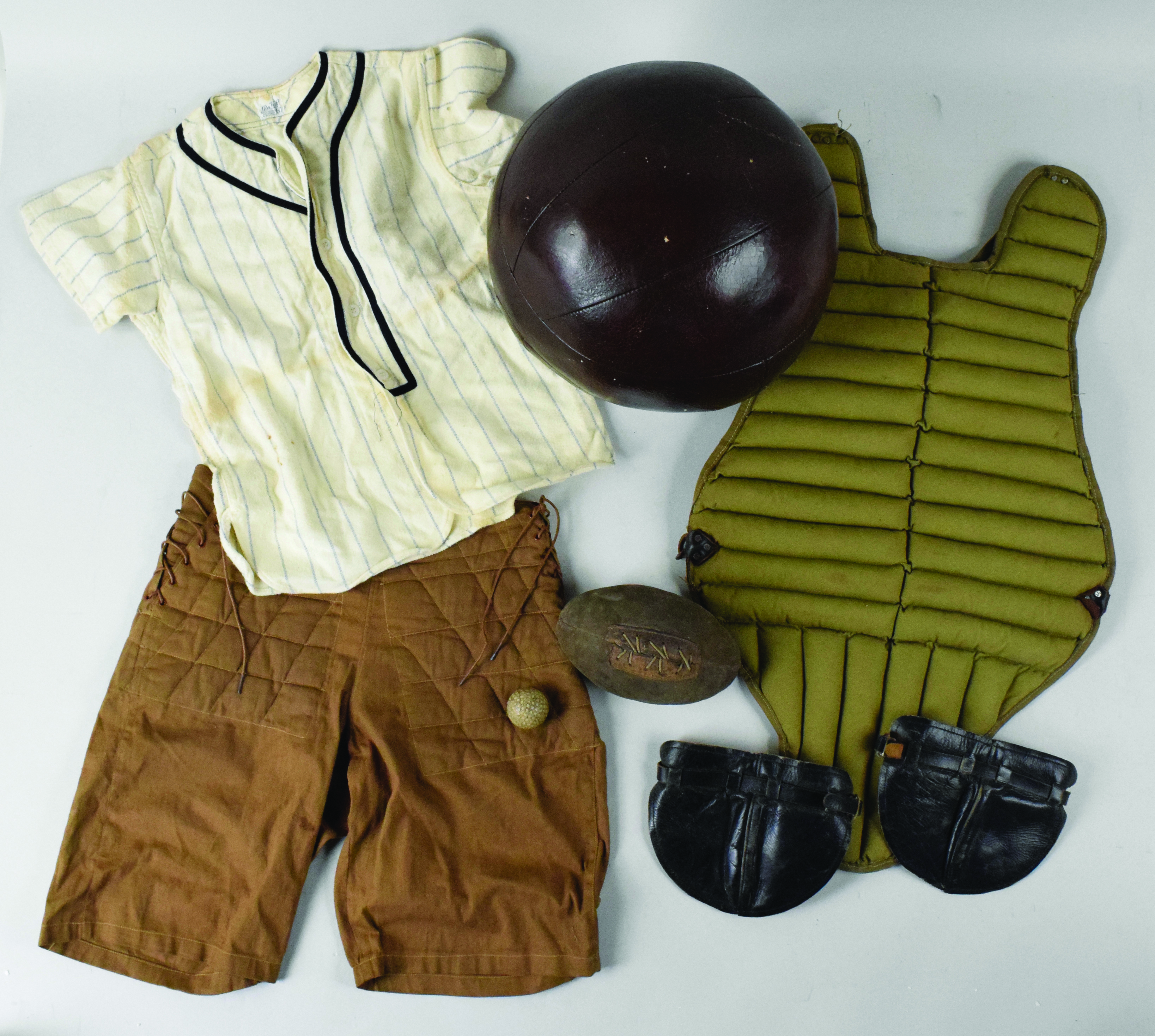 Description:Collection of vintage sports equipment, including pants, footballs, medicine ball, c. 1920s-60s (VG-EX). Assortment of items (no markings/tags unless otherwise noted) includes (1) pair of football pants; (1) 13" leather medicine ball; (1) pair of leather knee pads; (1) Da Val size S youth model jersey; (1) catcher's chest protector; (2) leather mini footballs (6" & 8"); and (1) early golf ball. Range: VG-EX.