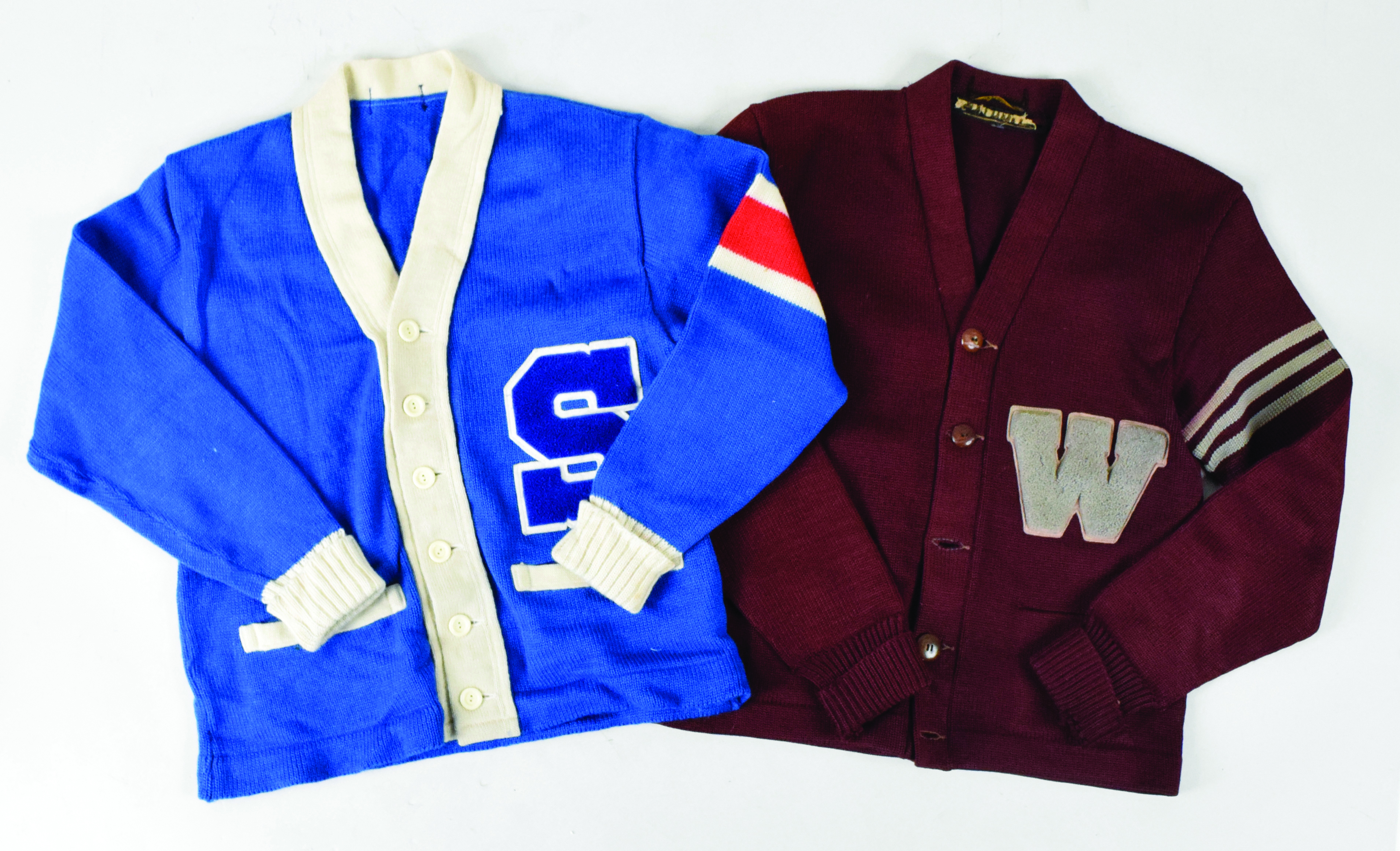 Description:Lot of (4) vintage letterman sweaters, 1920s-60s (EX-EX/MT). Lot of cardigan-style sweaters includes (1) untagged sweater with red stripe on left arm and "S" patch on the breast; (1) Octonek Knitting Co. (tag mostly missing) sweater with "W" patch on the breast; (1) Octoneck Knitting Co. sweater with "S" patch with crossed bats logo on the breast, "John" patch on right arm, panther logo on lower left tail and star patch on left arm; and (1) Parker sweater with "K" patch with track shoes logo and and "Arthur Broadhurst" name tag in the collar. Range: EX-EX/MT.