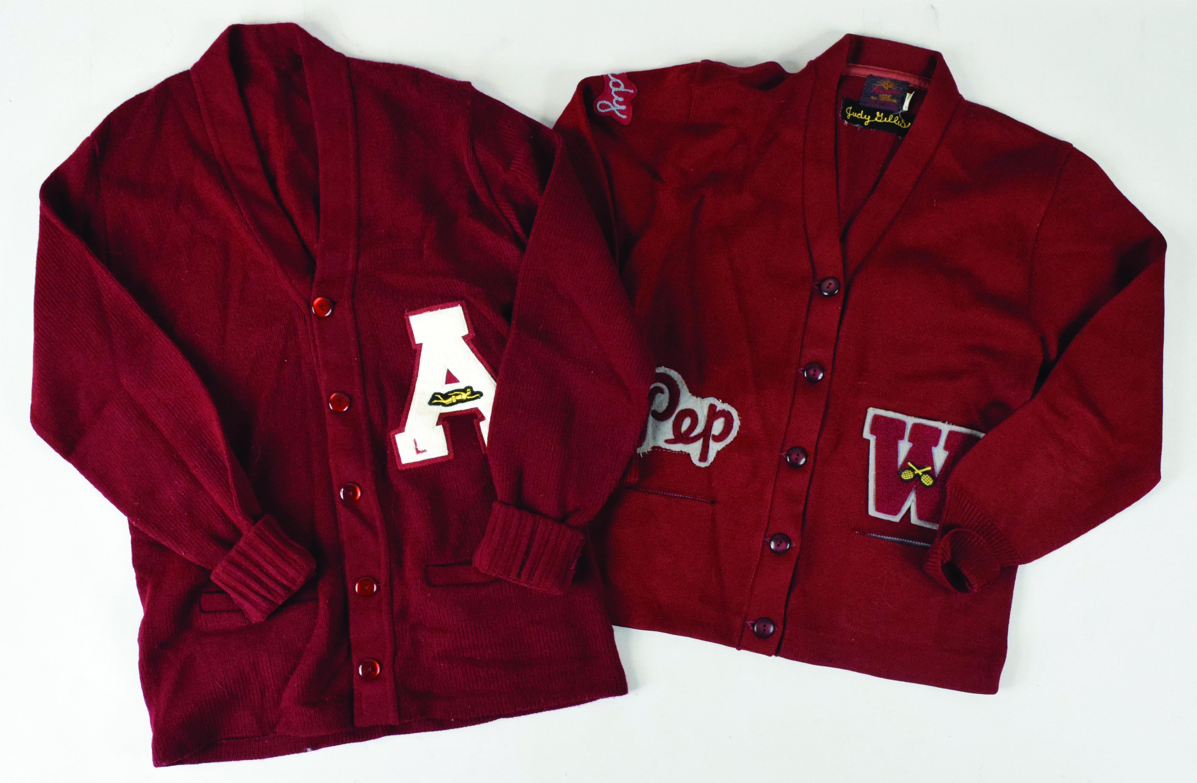 Description:Lot of (4) vintage letterman sweaters, 1920s-60s (EX-EX/MT). Lot of sweaters includes (1) Rugby Knitting Mills pullover sweater with "H" patch on the chest; (1) untagged cardigan-style sweater with "A" patch with swimming logo and "L" and "R" on the breast; (1) Kandel Knitting Mills cardigan-style sweater with "W" patch on the left tail with tennis racquets logo, "Pep" patch on the right tail and "Judy Gillis" name tag sewn in the collar and (1) Wilson size 42 cardigan-style sweater with "D" patch on the breast. Range: EX-EX/MT.